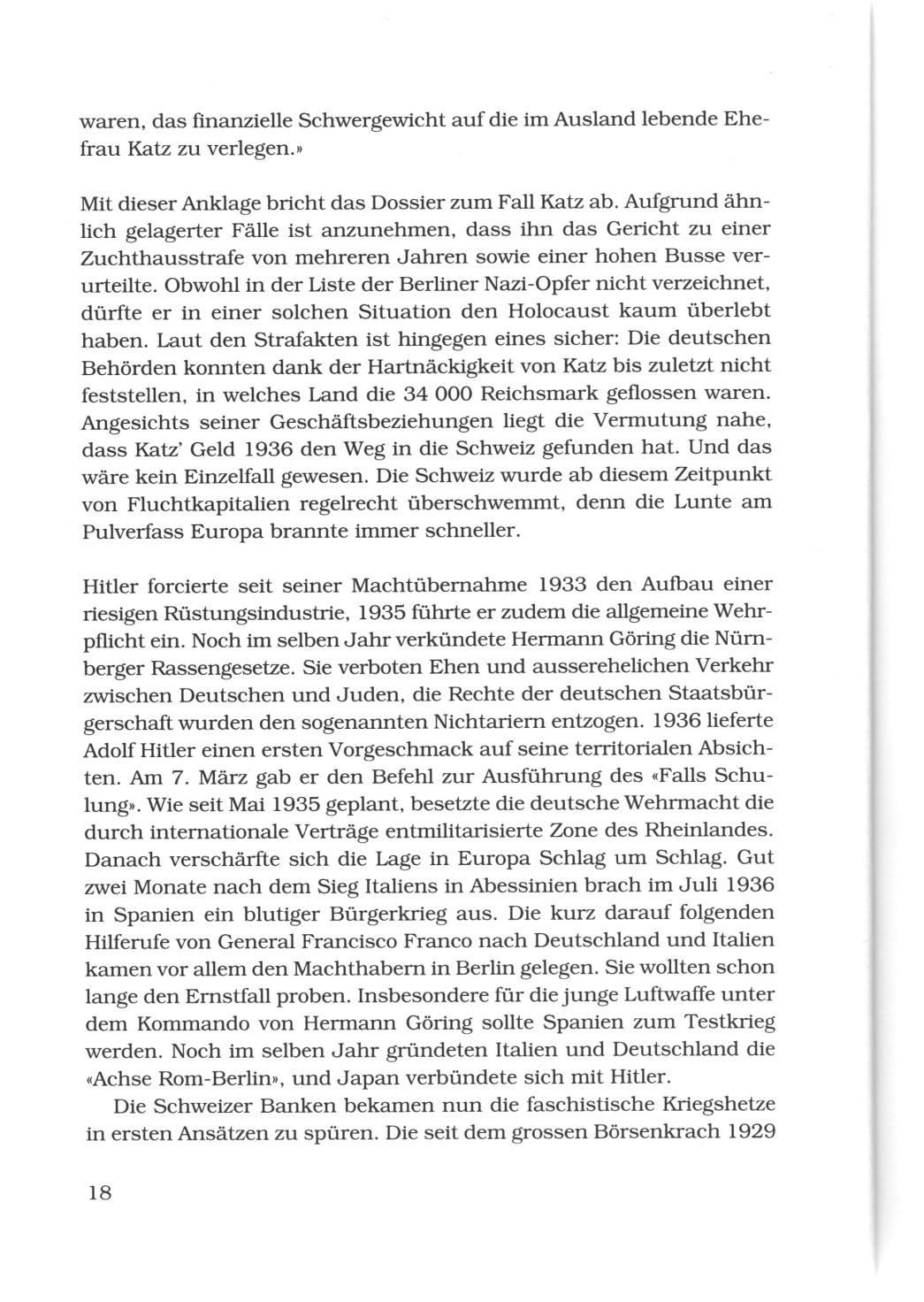 Mit dieser Anklage bricht das Dossier zum Fall Katz ab. Aufgrund ähnlich gelagerter Fälle ist anzunehmen, dass ihn das Gericht zu einer Zuchthausstrafe von mehreren Jahren sowie einer hohen Busse verurteilte. Obwohl in der Liste der Berliner Nazi-Opfer nicht verzeichnet, dürfte er in einer solchen Situation den Holocaust kaum überlebt haben. Laut den Strafakten ist hingegen eines sicher: Die deutschen Behörden konnten dank der Hartnäckigkeit von Katz bis zuletzt nicht feststellen, in welches Land die 34.000 Reichsmark geflossen waren. Angesichts seiner Geschäftsbeziehungen liegt die Vermutung nahe, dass Katz' Geld 1936 den Weg in die Schweiz gefunden hat. Und das wäre kein Einzelfall gewesen. Die Schweiz wurde ab diesem Zeitpunkt von Fluchtkapitalien regelrecht überschwemmt, denn die Lunte am Pulverfass Europa brannte immer schneller.