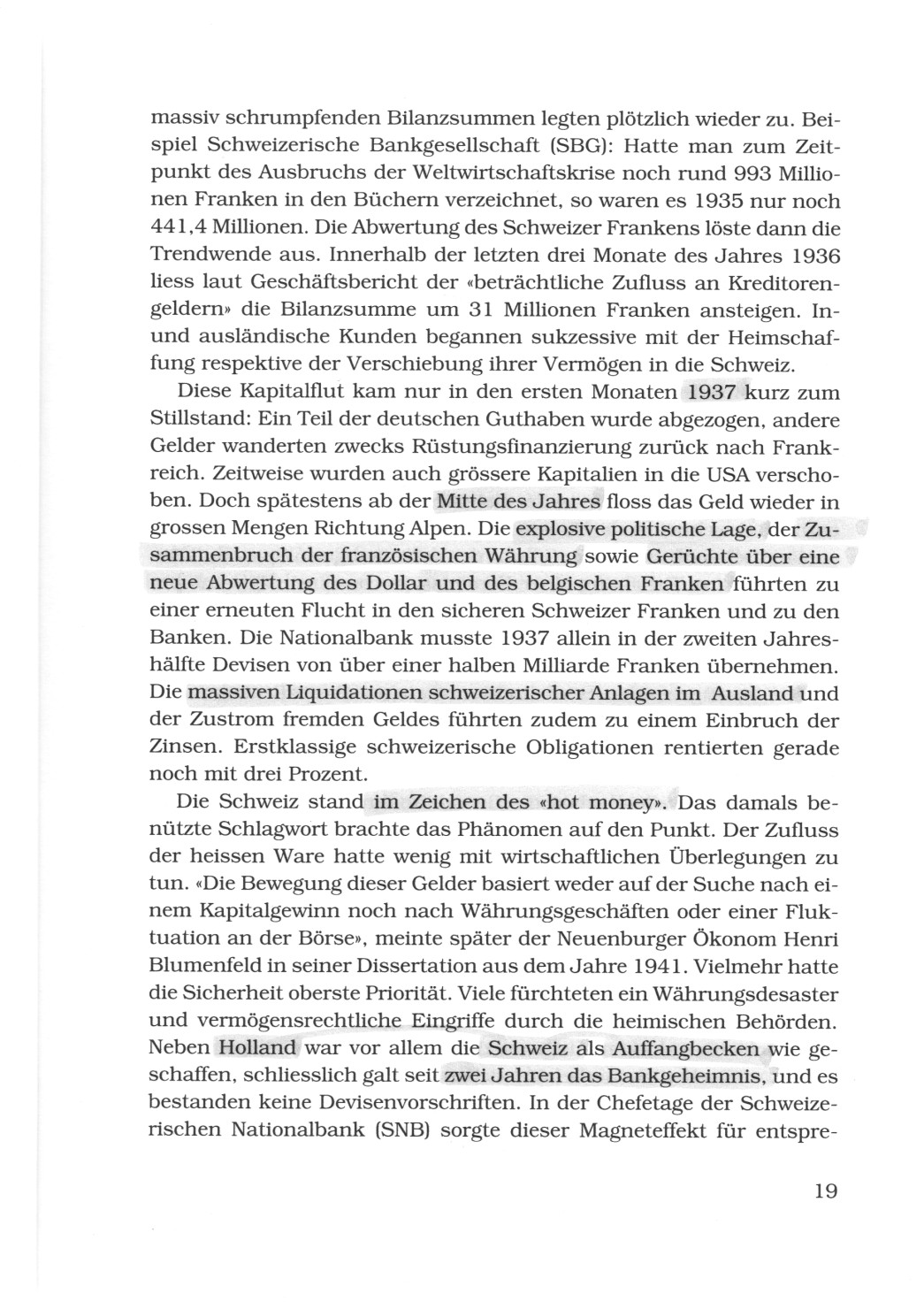 Die Schweiz stand im Zeichen des "hot money". Das damals benützte Schlagwort brachte das Phänomen auf den Punkt. Der Zufluss der heissen Ware hatte wenig mit wirtschaftlichen Überlegungen zu tun. "Die Bewegung dieser Gelder basiert weder auf der Suche nach einem Kapitalgewinn noch nach Währungsgeschäften oder einer Fluktuation an der Börse", meinte später der Neuenburger Ökonom Henri Blumenfeld in seiner Dissertation aus dem Jahre 1941. Vielmehr hatte die Sicherheit oberste Priorität. Viele fürchteten ein Währungsdesaster und vermögensrechtliche Eingriffe durch die heimischen Behörden. Neben Holland war vor allem die Schweiz als Auffangbecken wie geschaffen, schliesslich galt seit zwei Jahren das Bankgeheimnis, und es bestanden keine Devisenvorschriften. In der Chefetage der Schweizerischen Nationalbank (SNB) sorgte dieser Magneteffekt für entsprechend (S.19)