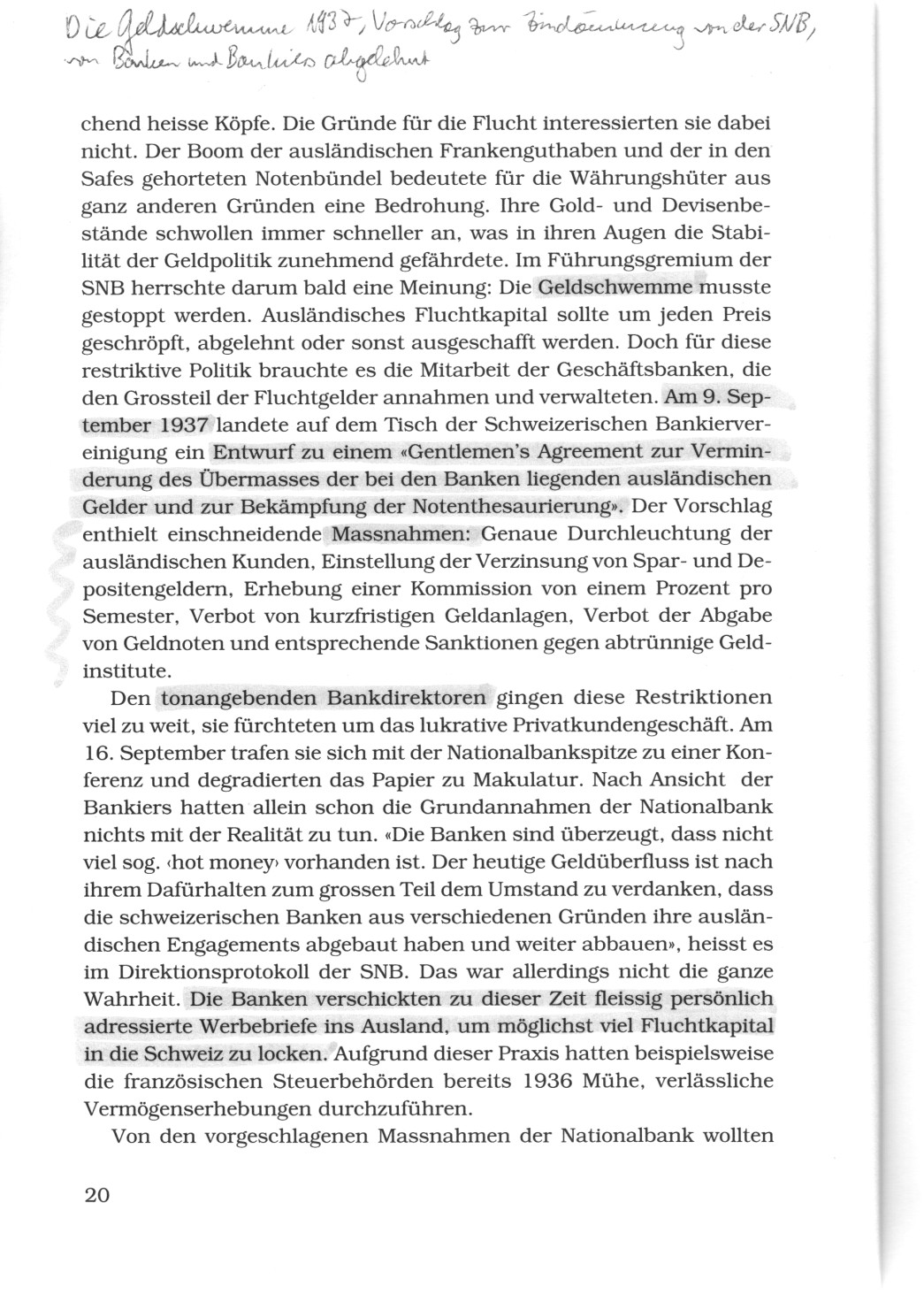Am 9. September 1937 landete auf dem Tisch der Schweizerischen Bankiervereinigung ein Entwurf zu einem "Gentlemen's Agreement zur Verminderung des Übermasses der bei den Banken liegenden, ausländischen Gelder und zur Bekämpfung der Notenthesaurierung". Der Vorschlag enthielt einschneidende Massnahmen: Genaue Durchleuchtung der ausländischen Kunden, Einstellung der Verzinsung von Spar- und Depositengeldern, Erhebung einer Kommission von einem Prozent pro Semester, Verbot von kurzfristigen Geldanlagen, Verbot der Abgabe von Geldnoten und entsprechende Sanktionen gegen abtrünnige Geldinstitute.