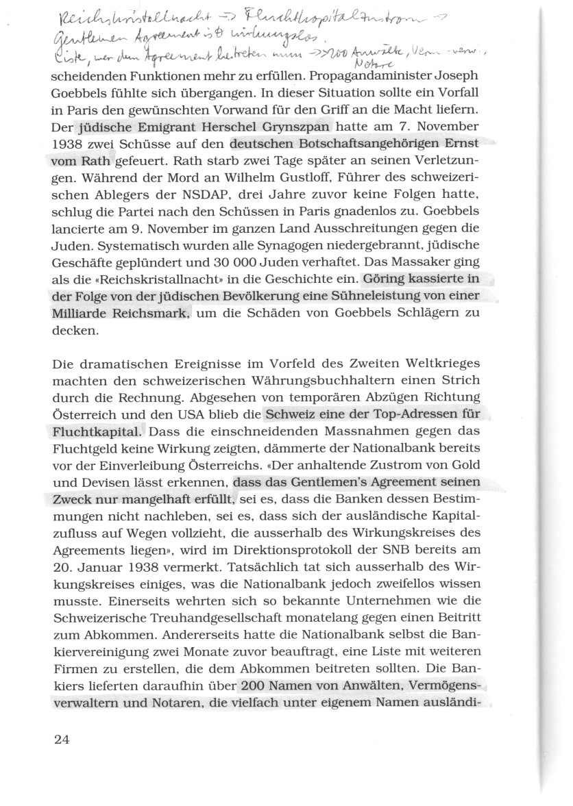 wachsende Risiko nicht mehr tragen zu können." Webers Botschaft war deutlich und liess den Bankiers keine Wahl mehr. Getreu der eidgenössischen Kompromisskultur wurde nur zwei Monate später, am 15. November 1937, ein leicht abgeändertes Gentlemen's Agreement unterschrieben, und die Banken verschickten an ihre ausländischen Kunden ein gemeinsam verfasstes Rundschreiben. Die hinter den Kulissen herrschende Eiszeit wurde in den offiziellen Statements verschwiegen. "Erfreulicherweise wurden im allgemeinen die Massnahmen gegen den unerwünschten Kapitalimport mit Verständnis aufgenommen", säuselten die Nationalbankiers in ihrem Geschäftsbericht. Und auch im Bankenlager mimte man plötzlich Verständnis für den harten Umgang mit der neuen ausländischen Kundschaft. "Die durchaus begreifliche Abwehr richtet sich nur gegen Auslandsgeld, das ohne Beziehung zur Schweiz einströmen möchte, um hier auf kürzeste Frist ein Asyl zu suchen und das Land ebenso rasch wieder zu verlassen, wenn es anderswo eine sicherere Ruhestätte zu finden meint. An solchem flüchtigen Kapital haben wir in der Tat in der Schweiz so gut wie kein Interesse", stellte die Schweizerische Kreditanstalt [SKA, heute CS] in ihrem Monatsbulletin vom Februar 1938 klar.