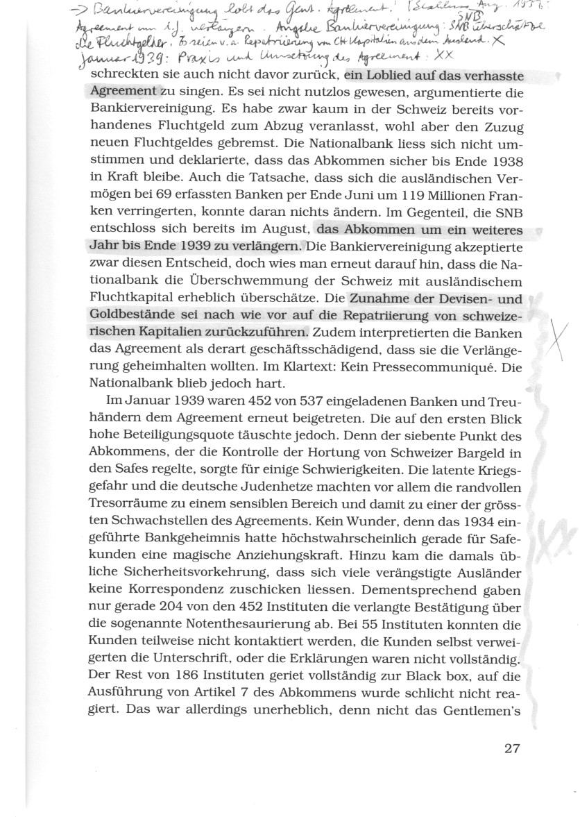 Die Banken wollten in der Sitzung von solchen Vorgängen nichts wissen und machten gleichzeitig geltend, dass es ihnen nicht zugemutet werden könne, über die wirkliche Zugehörigkeit dieser inländischen Gelder in schweizer Währung Nachforschungen anzustellen. Die Haltung der Banken erstaunt nicht. Sie wollten die Beschränkungen des Abkommens so schnell wie möglich vom Hals haben. Darum (S.26)