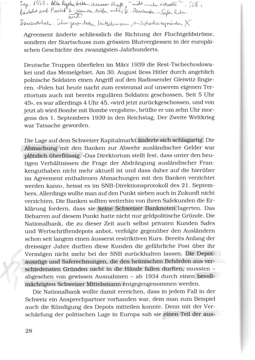 Die Nationalbank wollte damit erreichen, dass in jedem Fall in der Schweiz ein Ansprechpartner vorhanden war, dem man zum Beispiel auch de Kündigung des Depots mitteilen konnte. Denn mit der Verschärfung der politischen Lage in Europa sah sie einen Teil der ausländischen (S.28)