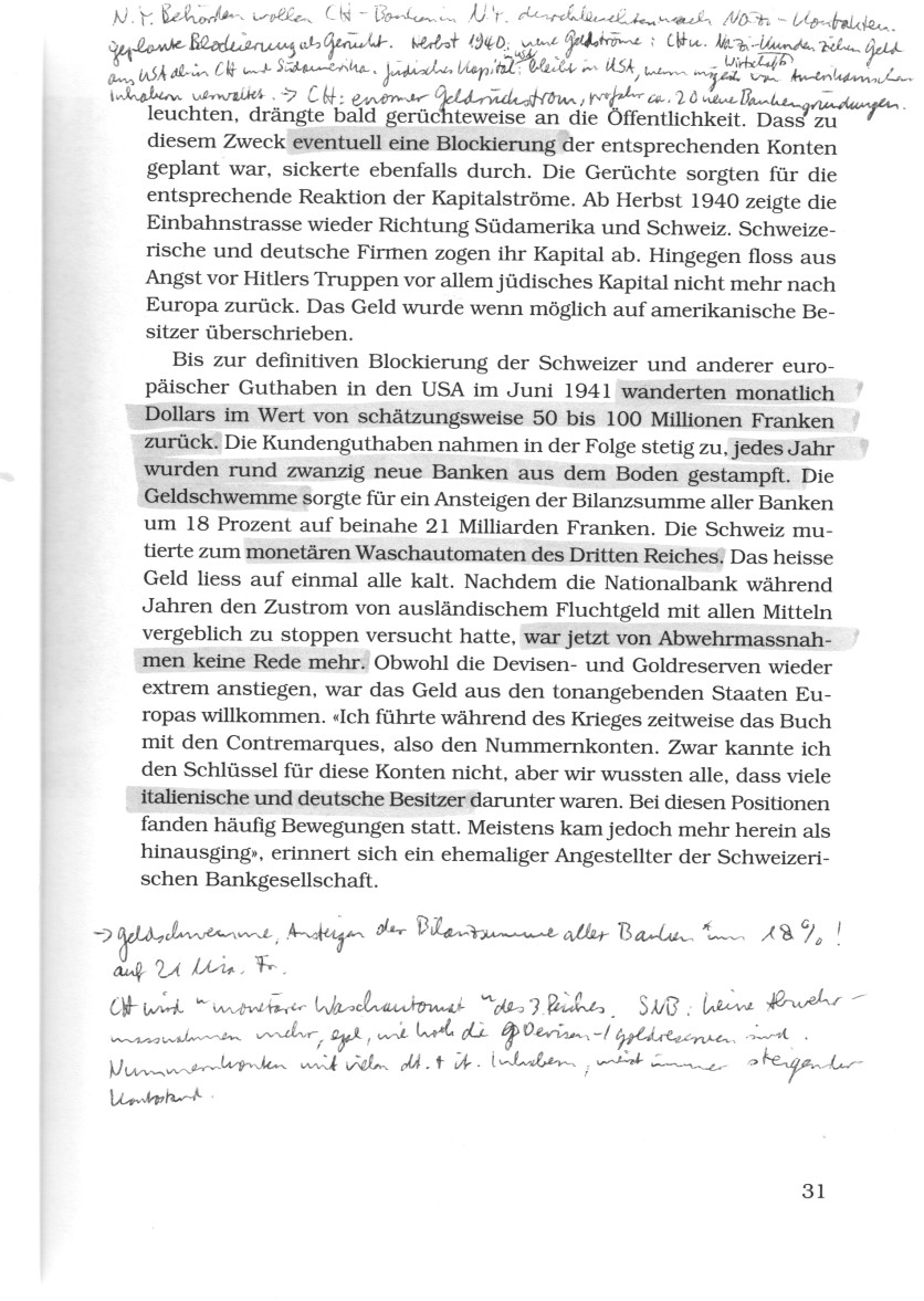 [Die Blockade schweizer und europäischer Guthaben in den "USA" ab Juni 1941 war eine scheinheilige Massnahme, um innerhalb der Alliierten gegen das Dritte Reich zu stehen. Die "amerikanische" Rüstungsindustrie leistete dem Dritten Reich wesentliche Schützenhilfe, bis April 1945. Buch von Charles Higham: Trading with the enemy].