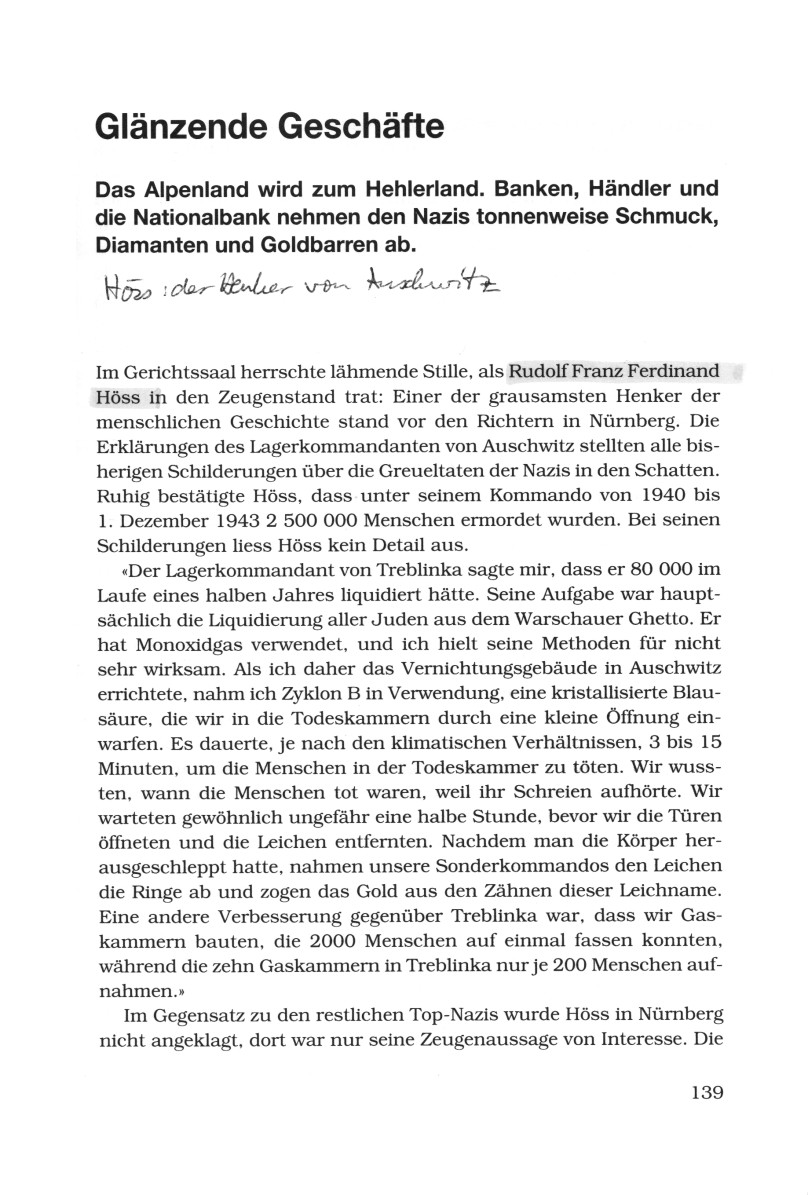 Die [S.139] Aburteilung von Hitlers Henker [der eben kein Henker war, das ist alles nur zionistische Lüge] wollte man den Polen überlassen. Dem Kommandanten von Auschwitz wurde 1947 in Warschau der [gefälschte] Prozess gemacht. Bereits am ersten Verhandlungstag kam Höss in seinen grausamen Schilderungen [die gefälscht sind] auch auf die Schweiz zu sprechen [und die Vorgänge in der Schweiz waren tatsächlich geschehen]. "Den Leichen wurden goldene Zähne ausgerissen, und man nahm ihnen die Kostbarkeiten und den Schmuck weg [die SS beschlagnahmte einfach ihre Koffer]. Das Gold wurde in Stäbe umgeschmolzen und zur Reichsbank nach Berlin gesandt. Gegenstände des täglichen Gebrauchs wurden waggonweise ins Reich abgeschoben und dort an die Bevölkerung verteilt. Die Kostbarkeiten wurden im Wege einer besonderen Abteilung der Reichsbank in die Schweiz zum Umtausch in Devisen gesendet", berichtete die "Berner Tagwacht" am 18. März 1947.