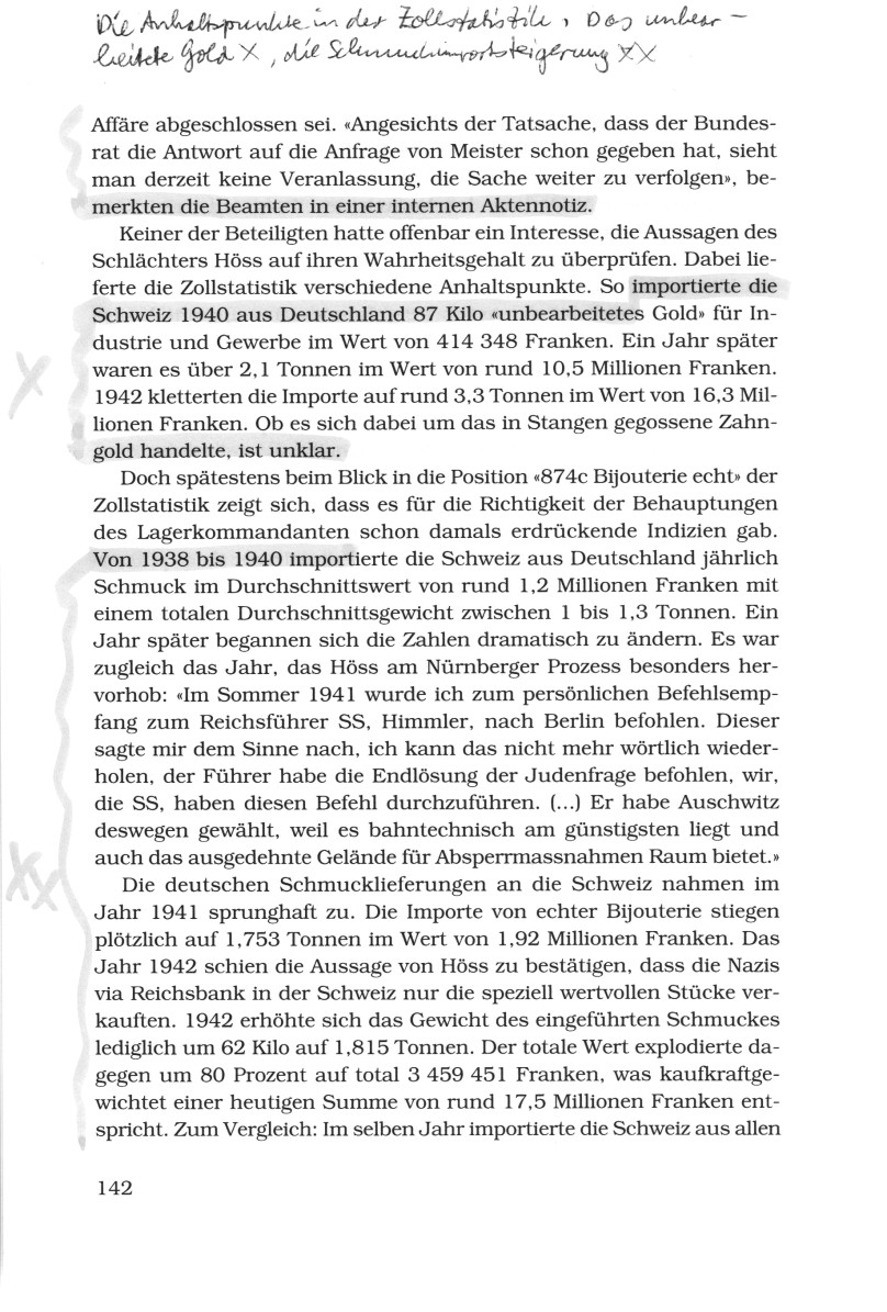 Keiner der Beteiligten hatte offenbar ein Interesse, die Aussagen des Schlächters [von] Höss auf ihren Wahrheitsgehalt zu überprüfen. Dabei lieferte die Zollstatistik verschiedene Anhaltspunkte. So importierte die Schweiz 1940 aus Deutschland 87 Kilo "unbearbeitetes Gold" für Industrie und Gewerbe im Wert von 414.348 Franken. Ein Jahr später waren es über 2,1 Tonnen im Wert von rund 10,5 Millionen Franken. 1942 kletterten die Importe auf rund 3,3 Tonnen im Wert von 16,3 Millionen Franken. Ob es sich dabei um das in Stangen gegossene Zahngold handelte, ist unklar.