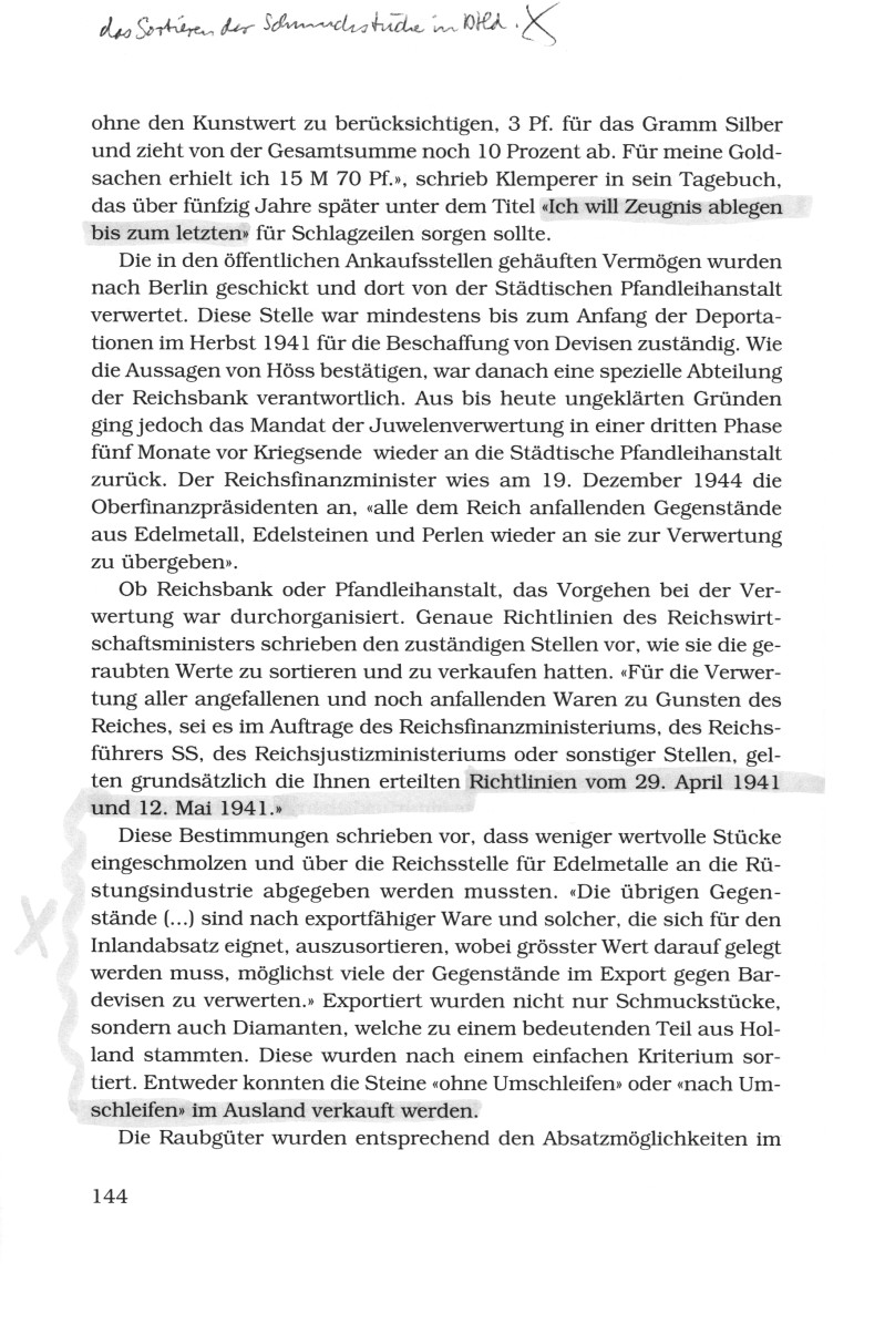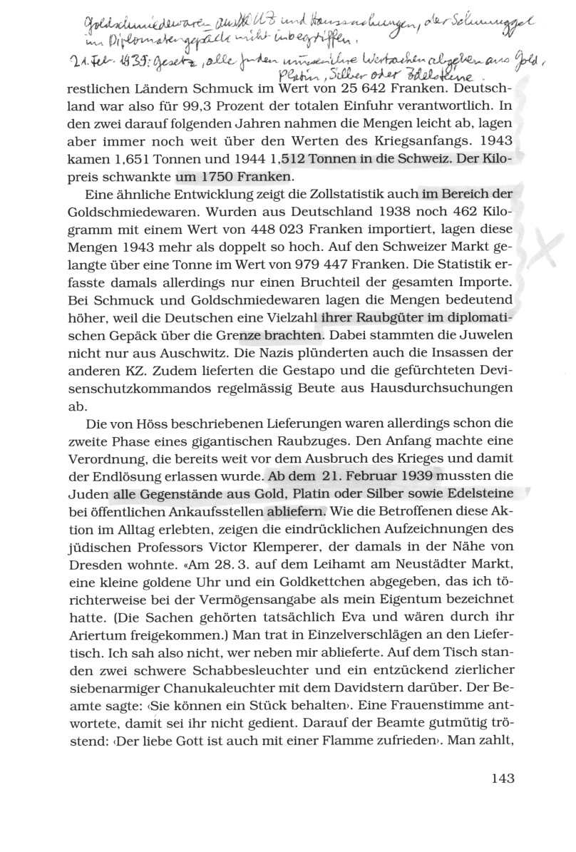Die von Höss beschriebenen Lieferungen waren allerdings schon die zweite Phase eines gigantischen Raubzuges. Den Anfang machte eine Verordnung, die bereits weit vor dem Ausbruch des [europäischen] Krieges und damit der Endlösung erlassen wurde. Ab dem 21. Februar 1939 mussten die Juden alle Gegenstände aus Gold, Platin oder Silber sowie Edelsteine bei öffentlichen Ankaufsstellen abliefern. Wie die Betroffenen diese Aktion im Alltag erlebten, zeigen die eindrücklichen Aufzeichnungen des jüdischen Professors Victor Klemperer, der damals in der Nähe von Dresden wohnte.