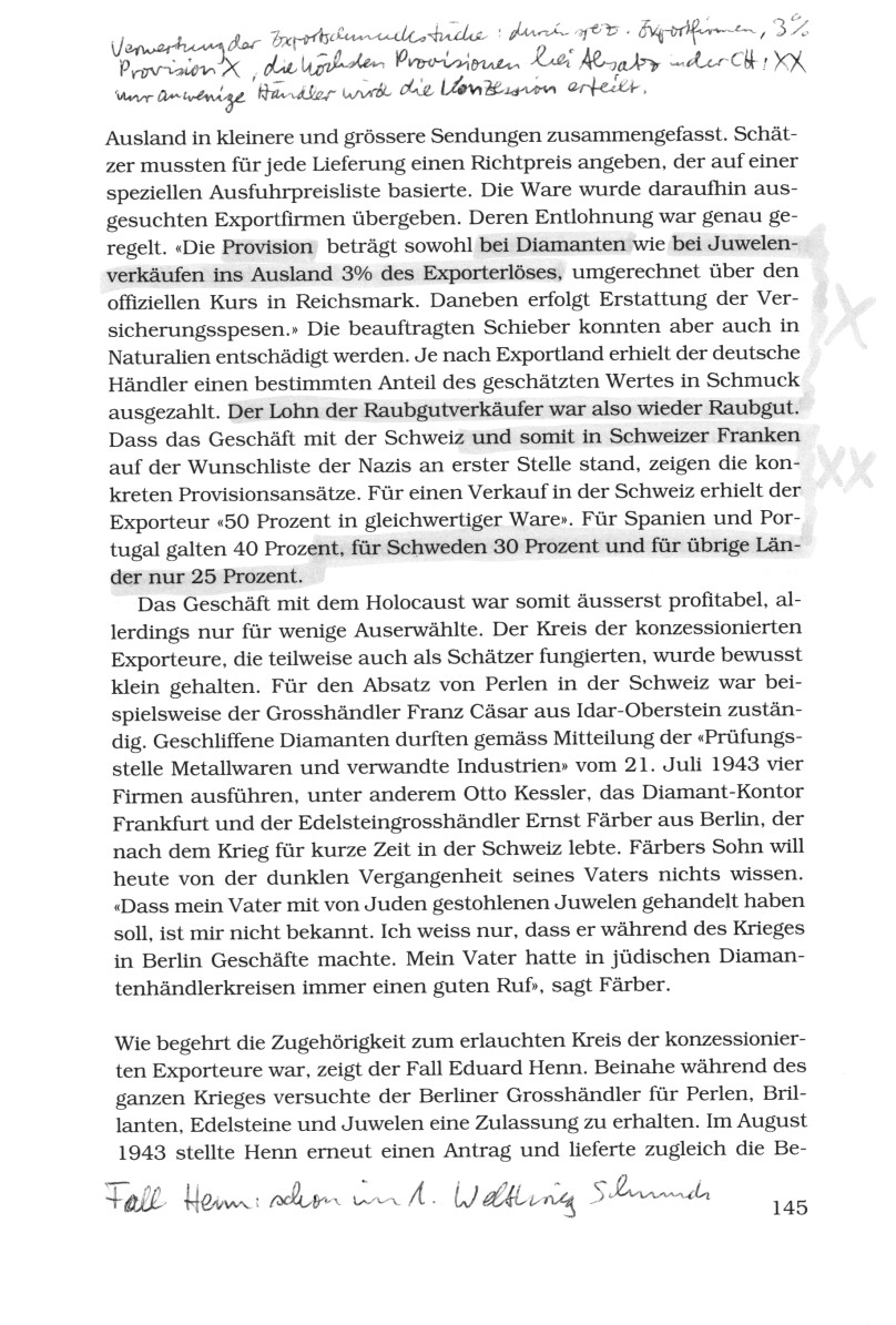 Wie begehrt die Zugehörigkeit zum erlauchten Kreis der konzessionierten Exporteure war, zeigt der Fall Eduard Henn. Beinahe während des ganzen Krieges versuchte der Berliner Grosshändler für Perlen, Brillanten, Edelsteine und Juwelen eine Zulassung zu erhalten. Im August 1943 stellte Henn erneut einen Antrag und lieferte zugleich die Begründung (S.145)