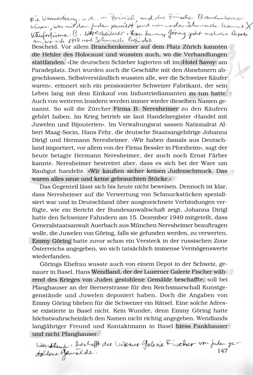 Das Gegenteil lässt sich bis heute [1997] nicht beweisen. Dennoch ist klar, dass Neresheimer auf die Verwertung von Schmuckstücken spezialisiert war und in Deutschland über ausgezeichnete Verbindungen verfügte, wie ein Bericht der Bundeanwaltschaft zeigt.
