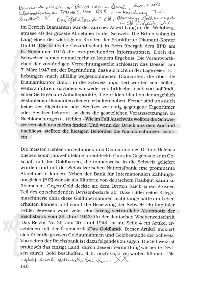 Im Bereich Diamanten war der Zürcher Albert Lang an der Weinbergstrasse 48 der grösste Abnehmer in der Schweiz. Die Briten sahen in Lang einen der wichtigsten Kunden der Frankfurter Diamant-Kontor GmbH. Die britische Gesandtschaft in Bern übergab dem EPD [Eidgenössischen Polizeidepartement] am 6. November 1945 die entsprechenden Informationen. Doch die Schweizer kamen einmal mehr zu keinem Ergebnis. Die Verantwortlichen der zuständigen Verrechnungsstelle schlossen das Dossier am 7. März 1947 mit der Begründung, dass sie nicht in der Lage seien, Erhebungen "nach allfällig weggenommenen Diamanten, die über die Diamantkontor GmbH in die Schweiz importiert worden sein sollen, weiterzuführen, nachdem wir weder von britischer noch von holländischer Seite genaue Anhaltspunkte, die zur Identifikation der angeblich gestohlenen Diamanten dienen, erhalten haben. Ferner sind uns auch keine des Eigentums oder Besitzes verlustig gegangene Eigentümer oder Besitzer bekannt, so dass die gesetzlichen Voraussetzungen zu Nachforschungen (...) fehlen." Wie im Fall Auschwitz wollten die Schweizer von sich aus nichts finden. Und wenn der Druck aus dem Ausland nachliess, stellten die hiesigen Behörden die Nachforschungen sofort ein.> (S.148).