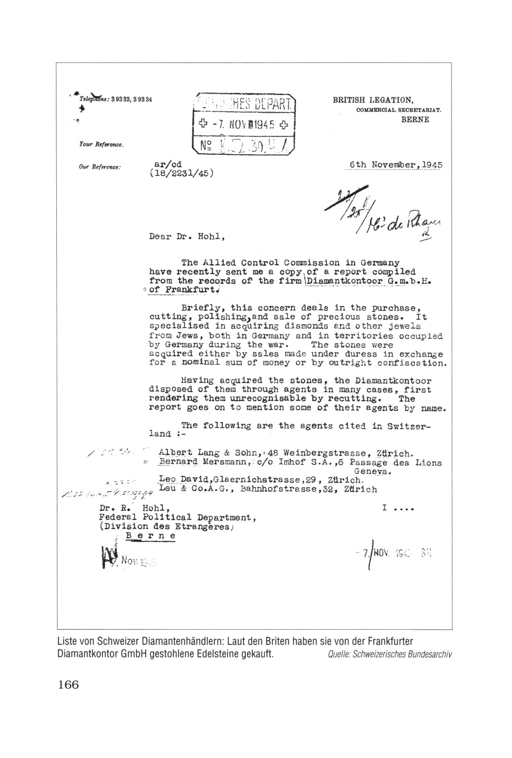 Seite 166: Dokument der GB-Botschaft vom November 1945: Schweinzer (schweizer) Händler kauften in Deutschland von Juden geklaute Diamanten: Liste von schweizer Diamantenhändlern: Laut den Briten haben sie von der Frankfurter Diamantkontor GmbH gestohlene Edelsteine gekauft.