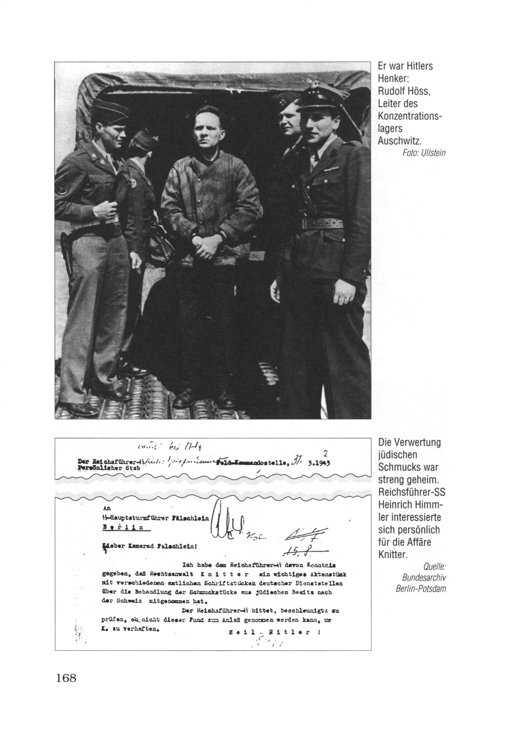 Seite 168: Höss, einer der Kommandanten des KZ Auschwitz, und ein Himmler-Dokument zur Affäre Knitter: Die Verwertung jüdischen Schmucks war streng geheim. Reichsführer-SS Heinrich Himmler interessierte sich persönlich für die Affäre.