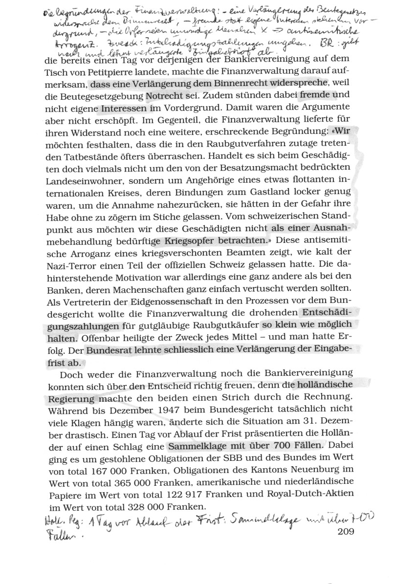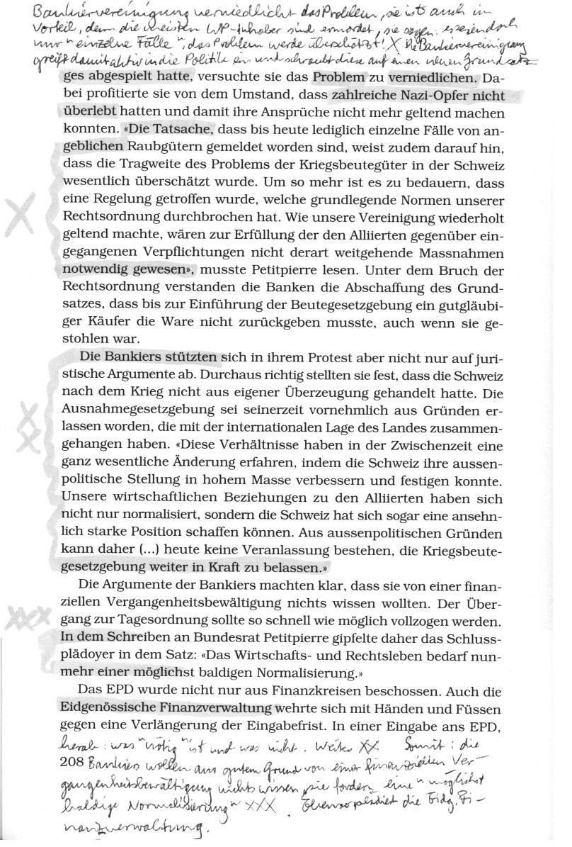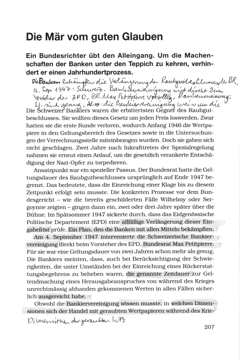 [Die Sozialisten waren ab 1945 in der Regierung im Bundesrat und hatten wahrscheinlich den Raubgutbeschluss gegen die rechtsradikale SVP und die kapitalistisch-schweizerische FDP erzwungen. Die Abstriche im Gesetz waren wahrscheinlich auf genau diese beiden raubenden Parteien SVP und FDP zurückzuführen, und sie torpedierten mit Vertretern das Gesetz, wo sie nur konnten, um ihre antisemitische Linie fortzufahren. Entnazifizierung gab es in der Schweiz ja nicht, sondern unterschwelliger Antisemitismus war weiterhin legal]Zwar hatten sie [die Bankiers] die erste Runde verloren, wodurch Anfang 1946 die Wertpapiere in den Geltungsbereich des Gesetzes sowie in die Untersuchungen der Verrechnungsstelle miteinbezogen wurden. Doch sie gaben sich nicht geschlagen. Zwei Jahre nach Inkrafttreten der Spezialregelung nahmen sie erneut einen Anlauf [Bankiers der rechtsradikalen SVP und der Kapitalistenpartei FDP], um die gesetzlich verankerte Entschädigung der Nazi-Opfer zu torpedieren