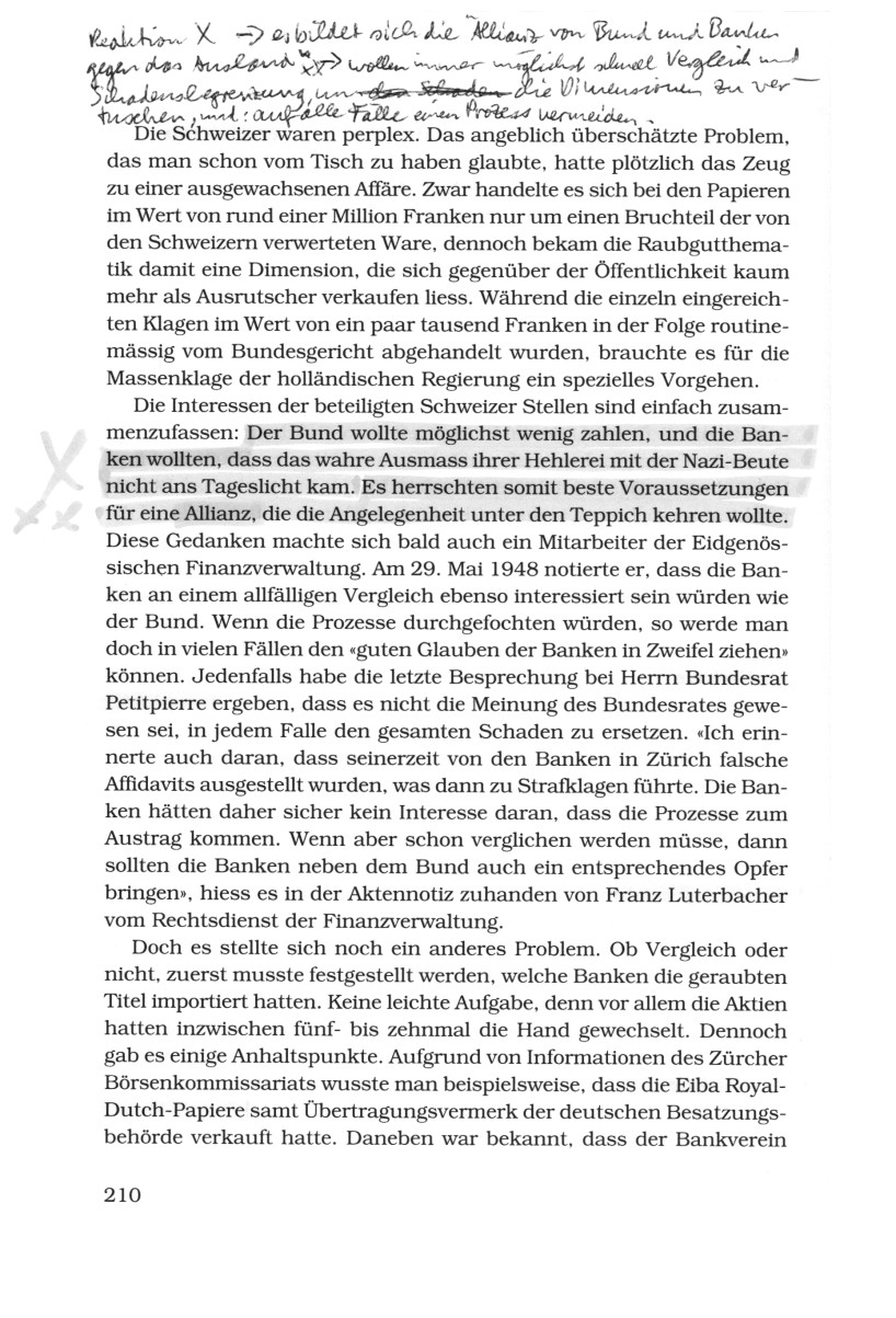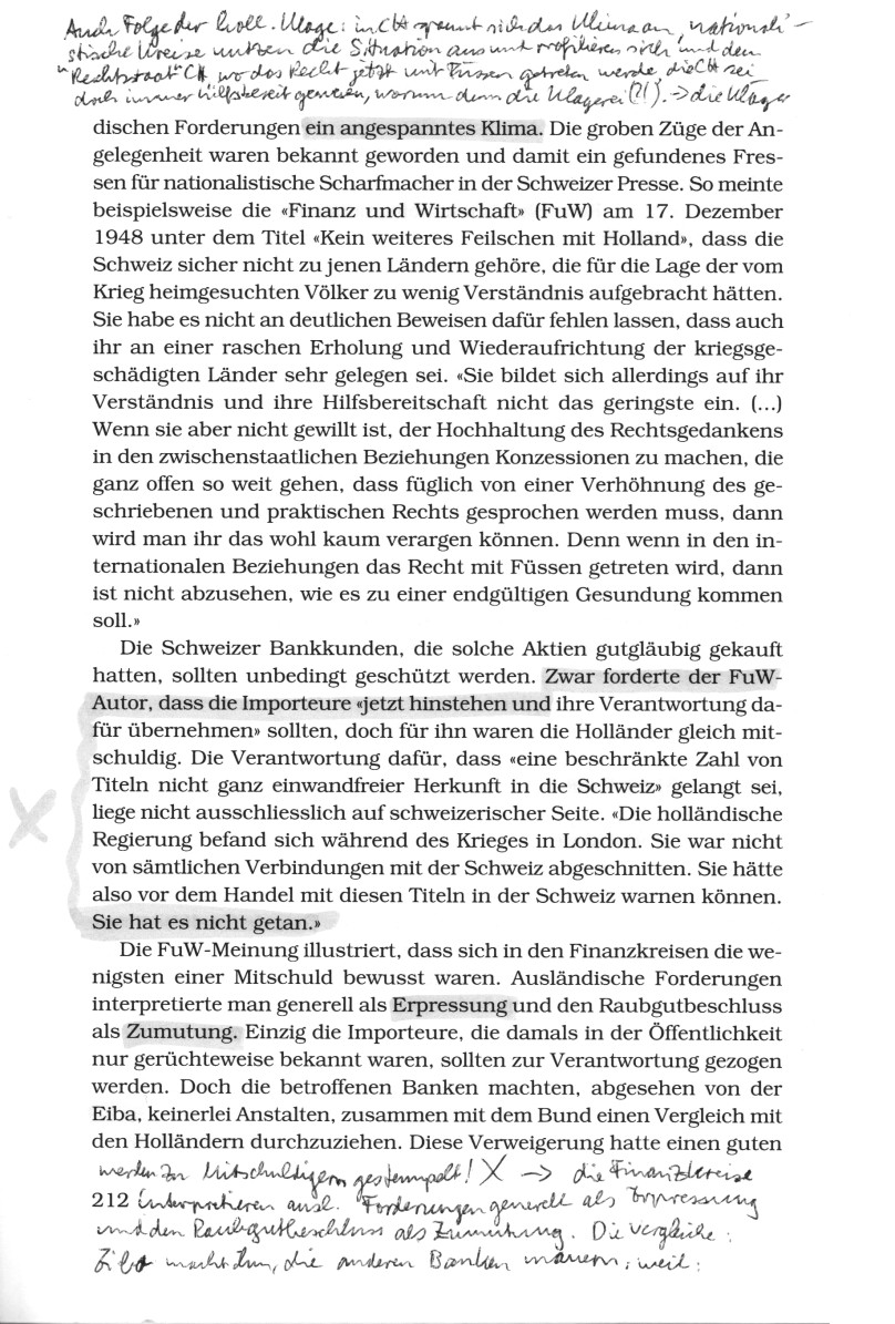 Die FuW-Meinung illustriert, dass sich in den Finanzkreisen die wenigsten einer Mitschuld bewusst waren. Ausländische Forderungen interpretierte man generell als Erpressung und den Raubgutbeschluss als Zumutung. Einzig die Importeure, die damals in der Öffentlichkeit nur gerüchteweise bekannt waren, sollten zur Verantwortung gezogen werden. Doch die betroffenen Banken machten, abgesehen von der Eiba, keinerlei Anstalten, zusammen mit dem Bund einen Vergleich mit den Holländern durchzuziehen. Diese Verweigerung hatte einen guten (S.212)