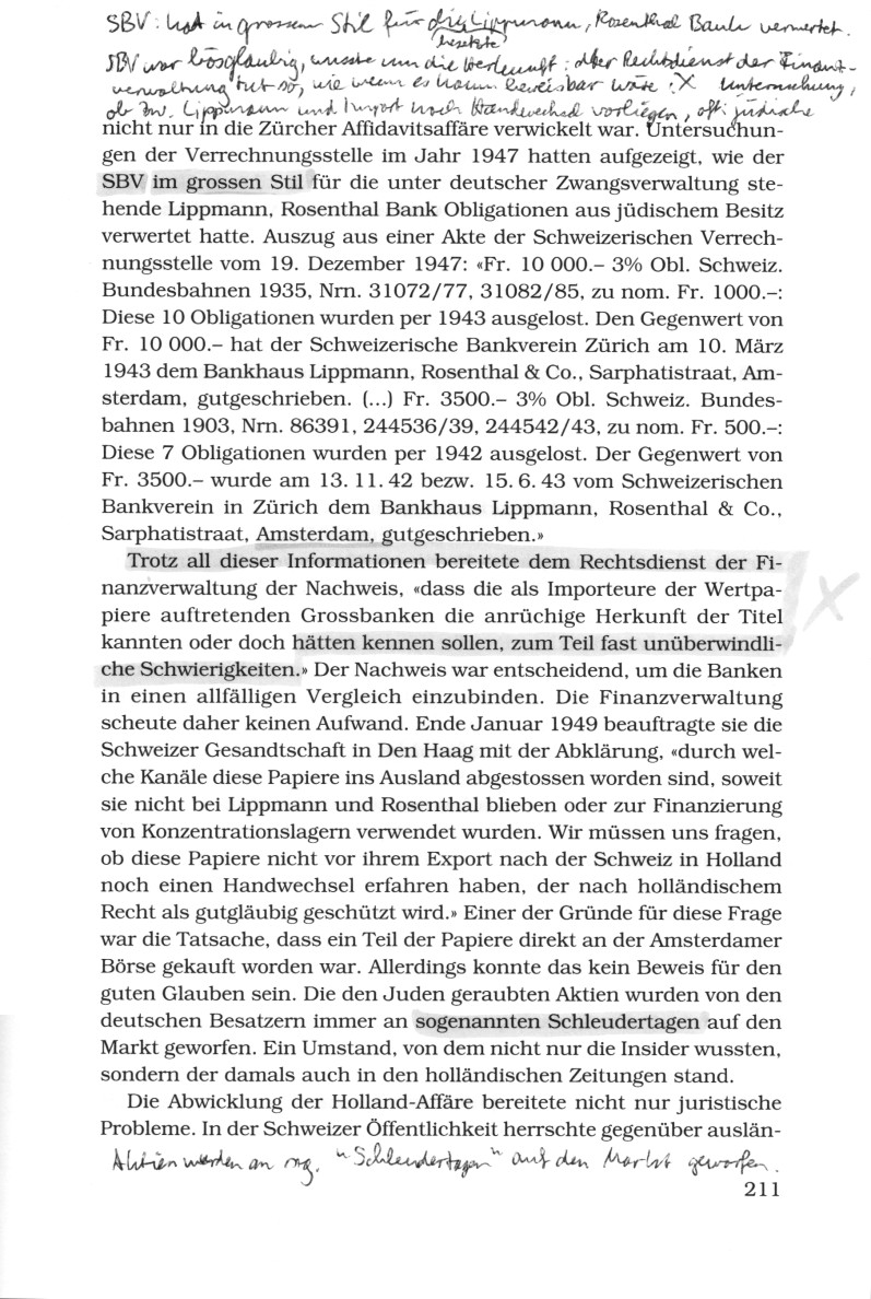 nicht nur in die Zürcher Affidavitsaffäre verwickelt war. Untersuchungen der Verrechnungsstelle im Jahr 1947 hatten aufgezeigt, wie der SBV [Schweizerischer Bankverein, heute der Basler Teil der kriminellen UBS AG] im grossen Stil für die unter deutscher Zwangsverwaltung stehende Lippmann, Rosenthal Bank Obligationen aus jüdischem Besitz verwertet hatte. Auszug aus einer Akte der Schweizerischen Verrechnungsstelle vom 19. Dezember 1947:
