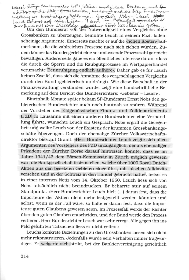 Die Grossbanken waren sich Leuchs Loyalität absolut sicher. Ihr Mann im Bundesgericht würde mit allen Mitteln kompromittierende Prozesse verhindern, womit sie getrost auf Zeit spielen konnten. Ausser der längst aufgeflogenen Otto-Wolff-Kundin Eiba, die sich an einer geheimen Sitzung bei der Finanzverwaltung mit einer Zahlung von 50.000 Franken aus der Affäre zu ziehen versuchte, verweigerten SKA [Schweizerische Kreditanstalt, heute CS], SBV [Schweizerischer Bankverein, heute UBS AG] und SBG [heute UBS AG, vom Bankverein übernommen] jegliche Beteiligung. Kaltschnäuzig behaupteten sie, dass sie sich von solch anrüchigen Importen stets ferngehalten hätten [obwohl in Prozessen von 1945-1947 schon oft das Gegenteil festgestellt worden war!!!] Die Käufe an der Amsterdamer Börse galten als gutgläubig, von "Schleudertagen" wollte niemand etwas wissen.