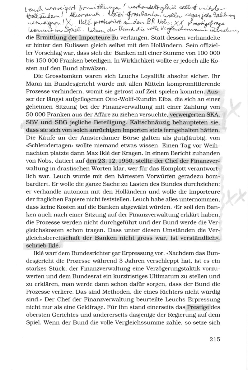 Leuchs konkrete Beziehungen zu den Grossbanken lassen sich nicht mehr rekonstruieren. Jedenfalls wurde sein Verhalten immer fragwürdiger. Er weigerte sich strikt, bei der Bankiervereinigung gerichtlich (S.214)
