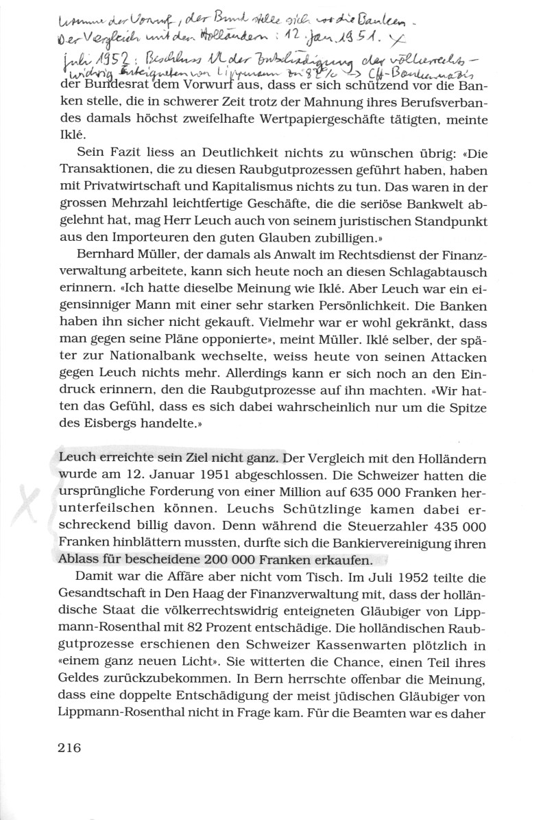 Dass der Börsenverkehr in Amsterdam alles andere als "regelrecht" war, verschwieg Leuch ebenso wie die Tatsache, dass den Grossbanken in anderen Raubgutprozessen die Kontakte mit Reichsbank und Golddiskontbank bereits nachgewiesen worden waren. Stattdessen prophezeite Leuch dem Bundesrat in einem allfälligen Prozess einen Freispruch der Grossbanken (S.213).