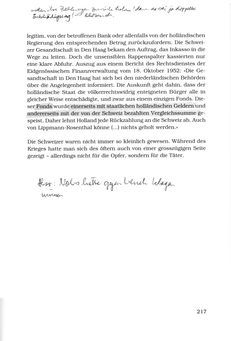Damit war die Affäre aber nicht vom Tisch. Im Juli 1952 teilte die Gesandtschaft in Den Haag der Finanzverwaltung mit, dass der holländische Staat die völkerrechtswidrig enteigneten Gläubiger von Lippmann-Rosenthal mit 82 Prozent entschädige. Die holländischen Raubgutprozesse erschienen den schweizer Kassenwarten plötzlich in "einem ganz neuen Licht". Sie witterten die Chance, einen Teil ihres Geldes zurückzubekommen. In Bern herrschte offenbar die Meinung, dass eine doppelte Entschädigung der meist jüdischen Gläubiger von Lippmann-Rosenthal nicht in Frage kam. Für die Beamten war es daher (S.216)