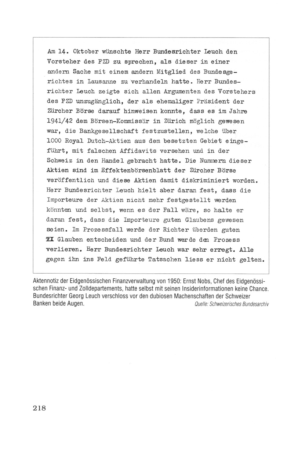 Seite 218: Dokument der Eidgenössischen Finanzverwaltung 1950: Bundesrichter Leuch (Ex-Boss der kriminellen Börse in Zureich (Zürich)) wehrt Nobs ab: Aktennotiz der Eidgenössischen Finanzverwaltung von 1950: Ernst Nobs, Chef des Eidgenössischen Finanz- und Zolldepartements, hatte selbst mit seinen Insiderinformationen keine Chance. Bundesrichter Georg Leuch verschloss vor den dubiosen Machenschaften der Schweinzer (Schweizer) Banken beide Augen.
