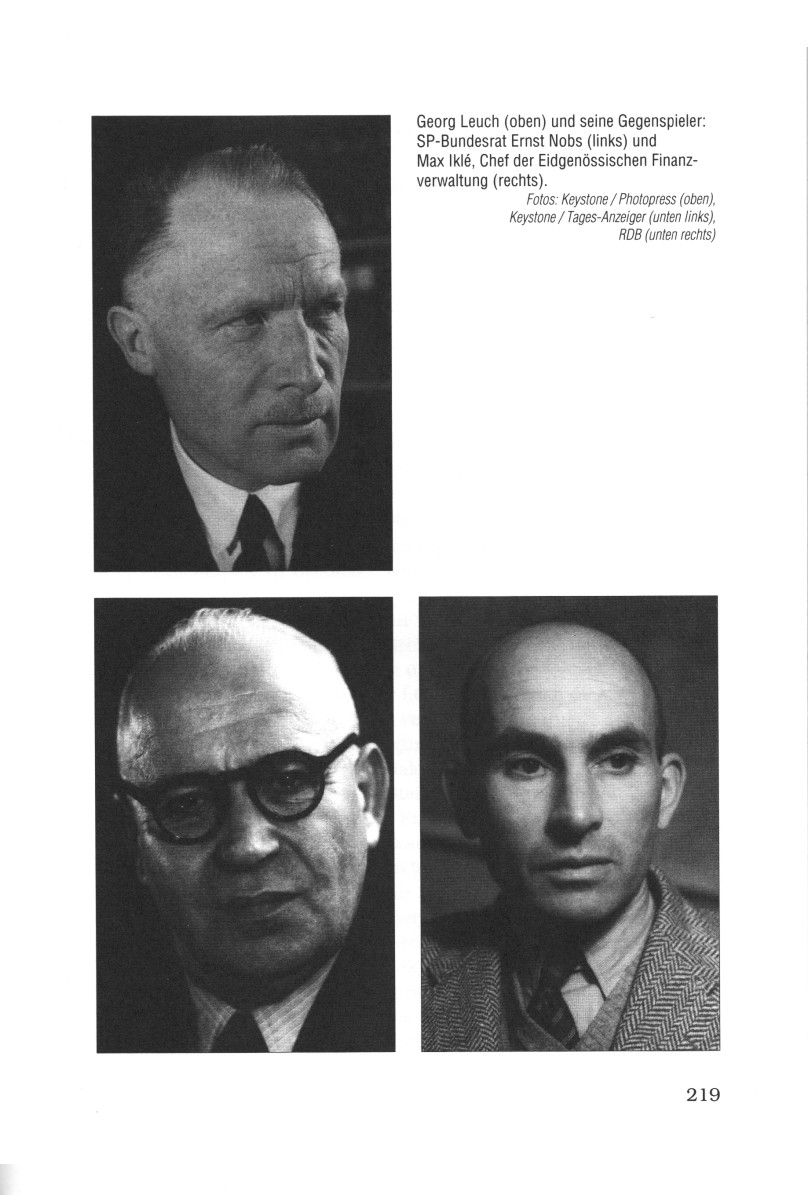 Seite 219: Leuch, Nobs und Iklé: Georg Leuch (oben) und seine Gegenspieler: SP-Bundesrat Ernst Nobs (links) und Max Iklé, Chef der Eidgenössischen Finanzverwaltung (rechts)