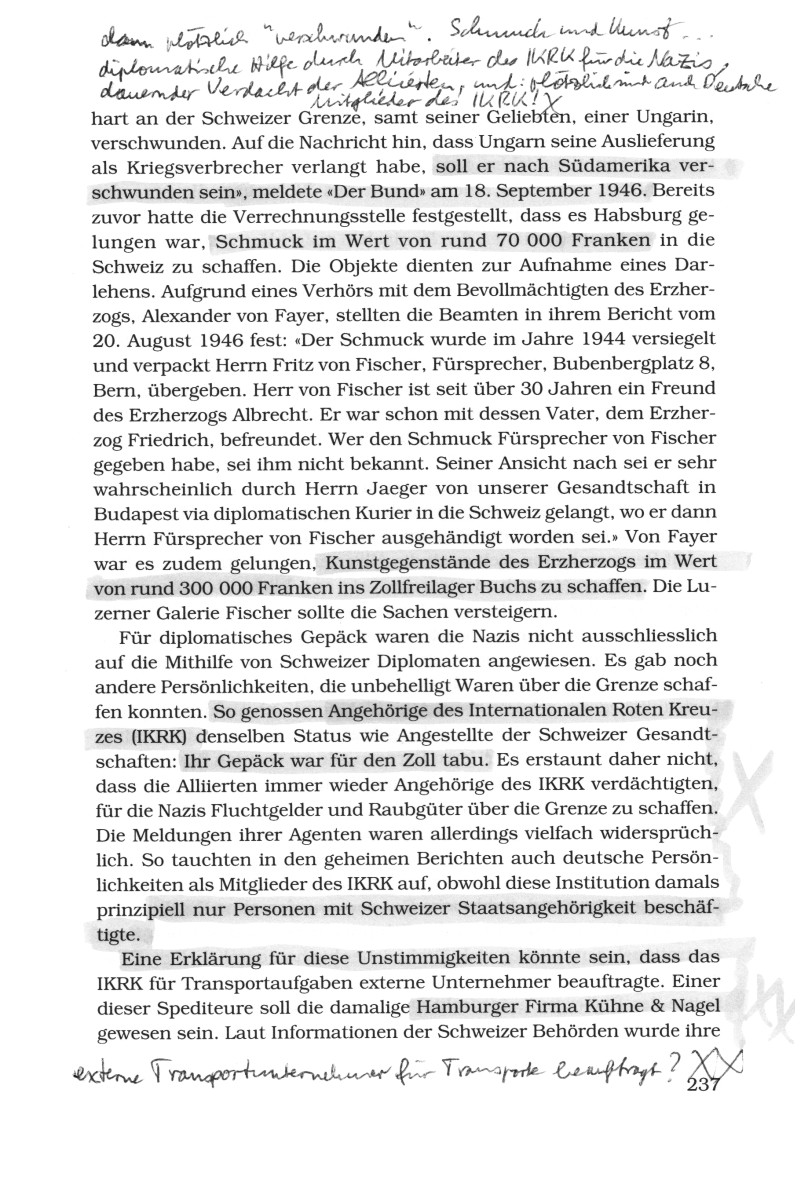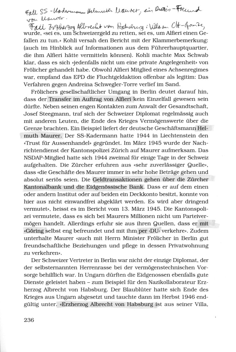 In Ungarn dürften die Eidgenossen ebenfalls gute Dienste geleistet haben - zum Beispiel für den Nazikollaborateur Erzherzog Albrecht von Habsburg. Der Blaublüter hatte sich Ende des Krieges aus Ungarn abgesetzt und tauchte dann im Herbst 1946 endgültig unter. "Erzherzog Albrecht von Habsburg ist aus seiner Villa (S.236)