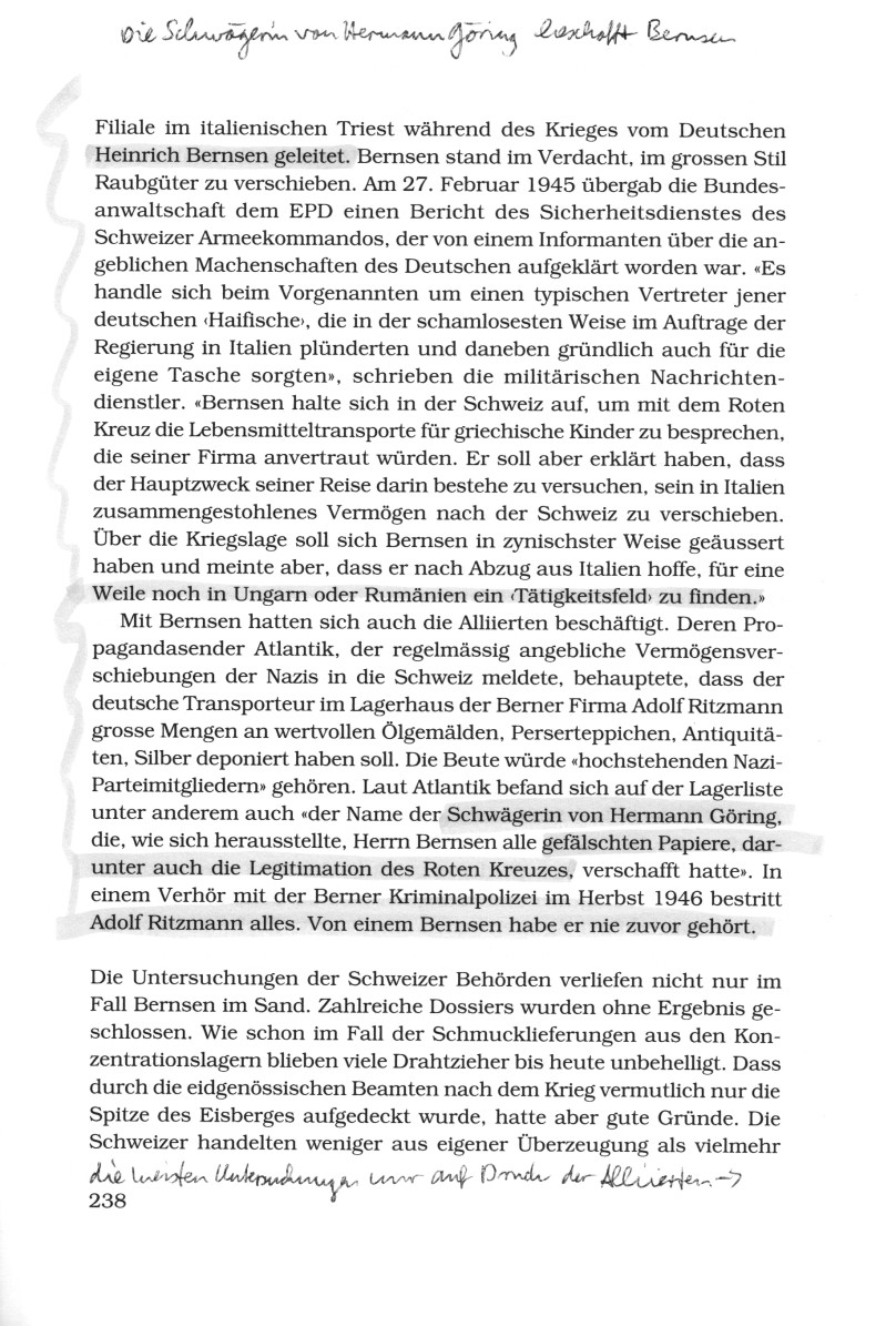 Zahlreiche Dossiers wurden ohne Ergebnis geschlossen. Wie schon im Fall der Schmucklieferungen aus den Konzentrationslagern blieben viele Drahtzieher [SS und Strohmänner der SS] bis heute unbehelligt. Dass durch die eidgenössischen Beamten nach dem Krieg vermutlich nur die Spitze des Eisberges aufgedeckt wurde, hatte aber gute Gründe. Die Schweizer handelten weniger aus eigener Überzeugung als vielmehr (S.238)
