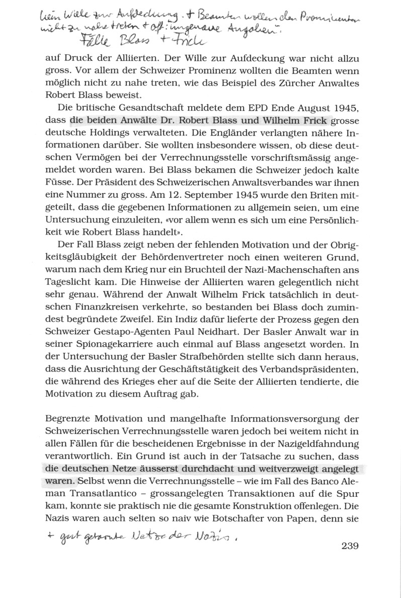 Die britische Gesandtschaft meldete dem EPD [schweizer Aussenministerium] Ende August 1945, dass die beiden Anwälte Dr. Robert Blass und Wilhelm Frick grosse deutsche Holdings verwalteten. Die Engländer verlangten nähere Informationen darüber Sie wollten insbesondere wissen, ob diese deutschen Vermögen bei der Verrechnungsstelle vorschriftsmässig angemeldet worden waren. Bei Blass bekamen die Schweizer jedoch kalte Füsse. Der Präsident des Schweizerischen Anwaltsverbandes war ihnen eine Nummer zu gross. Am 12. September 1945 wurde den Briten mitgeteilt, dass die gegebenen Informationen zu allgemein seien, um eine Untersuchung einzuleiten, "vor allem, wenn es sich um eine Persönlichkeit wie Robert Blass handelt".