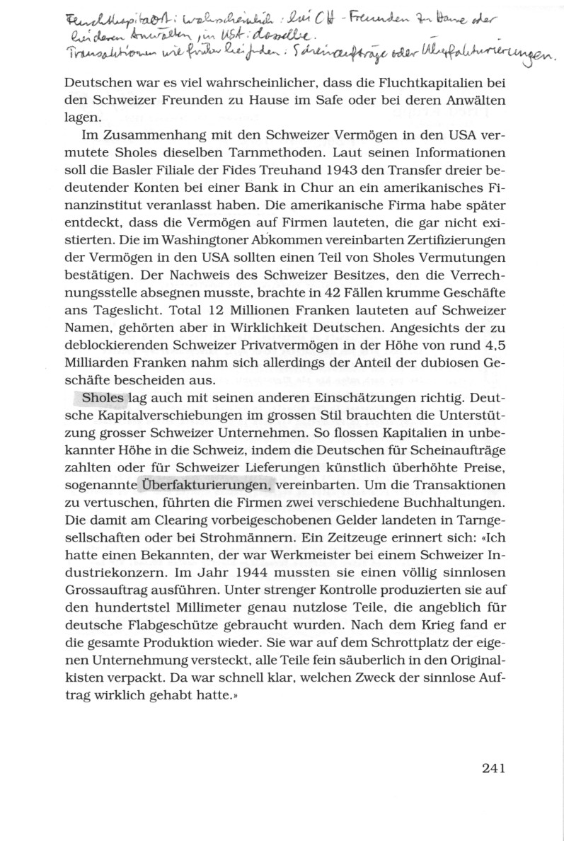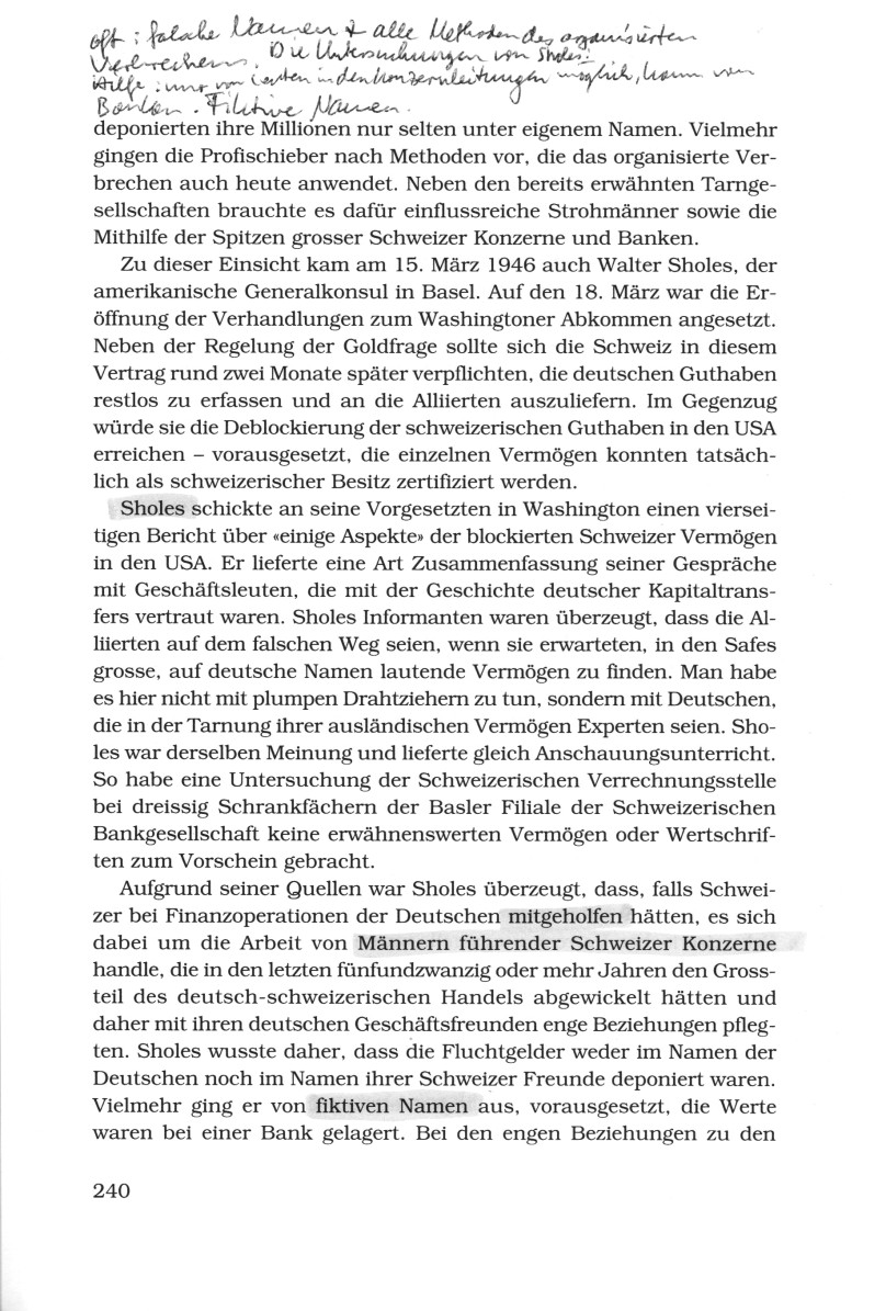 Aufgrund seiner Quellen war Sholes überzeugt, dass, falls Schweizer bei Finanzoperationen der Deutschen mitgeholfen hätten, es sich dabei um die Arbeit von Männern führender, schweizer Konzerne handle [Banken, Versicherungen, Ciba, La Roche, Nestlé, Bührle, ABB etc.], die in den letzten 25 oder mehr Jahren den Grossteil des deutsch-schweizerischen Handels [und die Arisierungen!!!] abgewickelt hätten und daher mit ihren deutschen Geschäftsfreunden enge Beziehungen pflegten. Sholes wusste daher, dass die Fluchtgelder weder im Namen der Deutschen noch im Namen ihrer schweizer Freunde deponiert waren. Vielmehr ging er von fiktiven Namen aus, vorausgesetzt, die Werte waren bei einer Bank gelagert. [Oft waren da gar keine Namen, sondern einfach Nummernkonten mit einem Code]. Bei den engen Beziehungen zu den (S.240)
