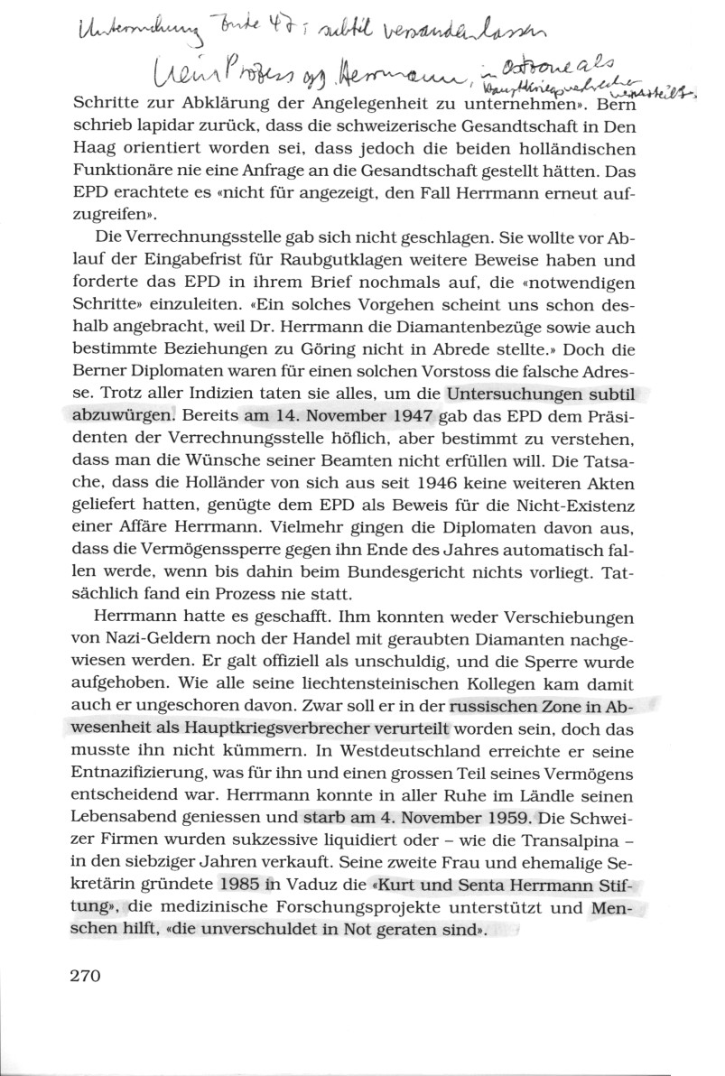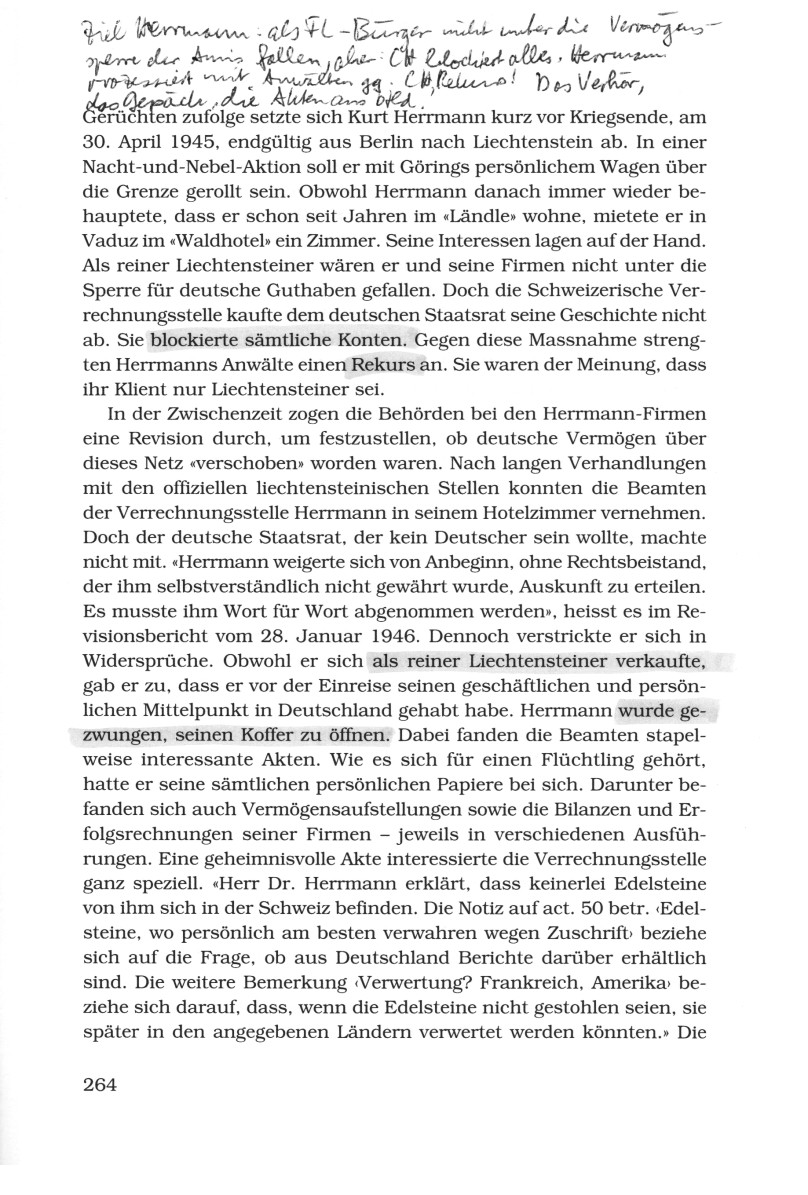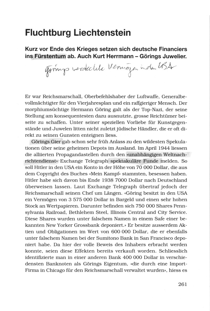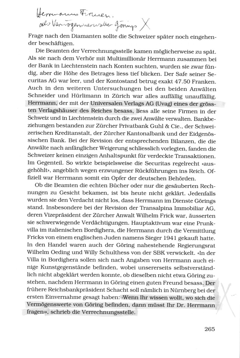 Seite 274: Dokument der Schweinzerischen (Schweizerischen) Verrechnungsstelle von 1947 mit Indizien, die gegen den Deutsch-Liechtensteiner Herrmann sprechen: Trotz schwerwiegender Indizien wollte das Eidgenössische Politische Departement (Aussenministerium) von einer Weiterverfolgung der Affäre Herrmann nichts wissen.Seite 275: Göring: Prunkfetischist Hermann Göring liess seinen Ehrendegen in Herrmanns Goldschmiedewerkstätten herstellen [seine Befehle zur "Verwertung" von Raubschmuck raubten allen Juden in Deutschland jeden Schmuck, und in der Schweinz (Schweiz) profitierten davon die Schmuckhändler, die "Verwertung" hatte ihr Zentrum in in Luzern].