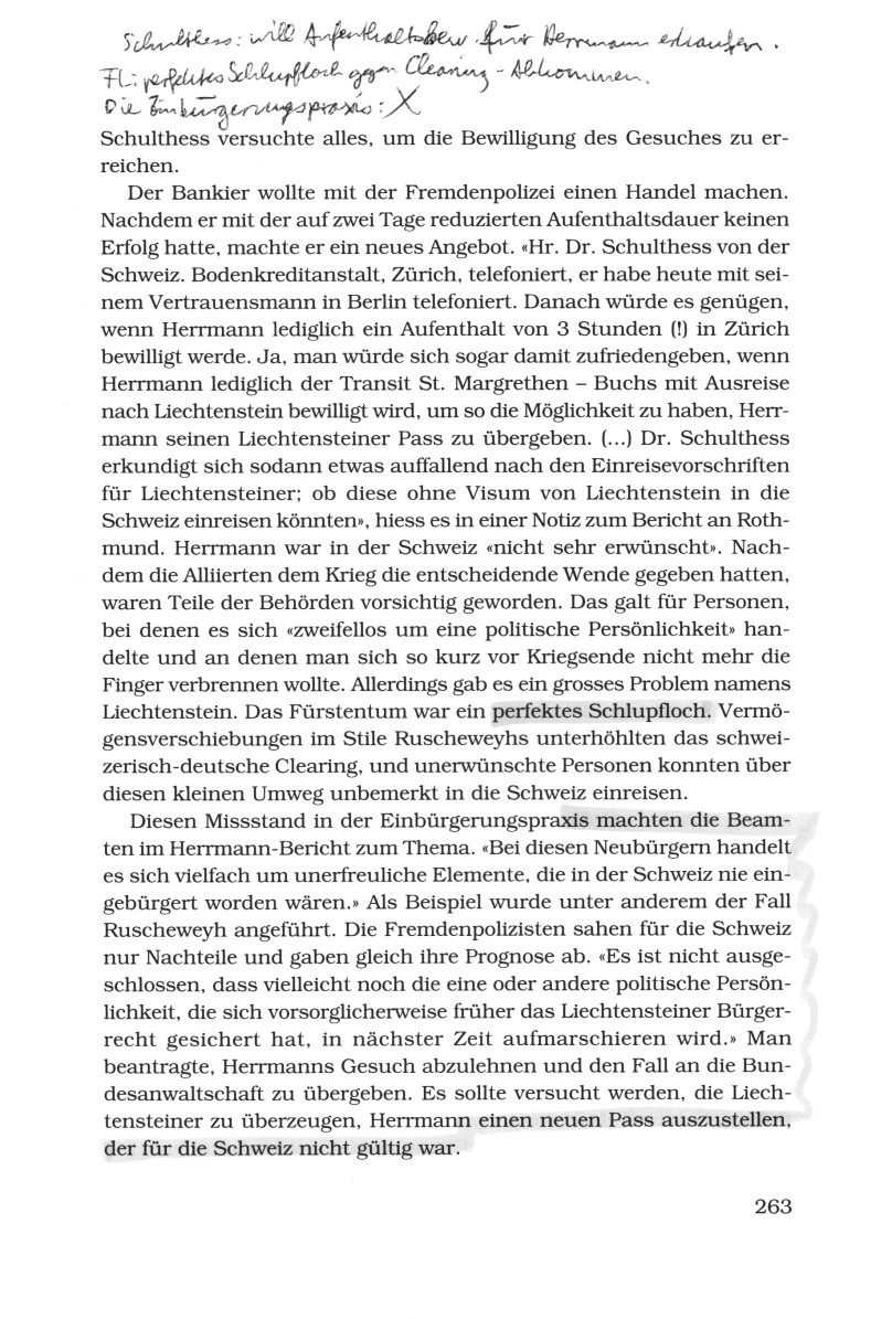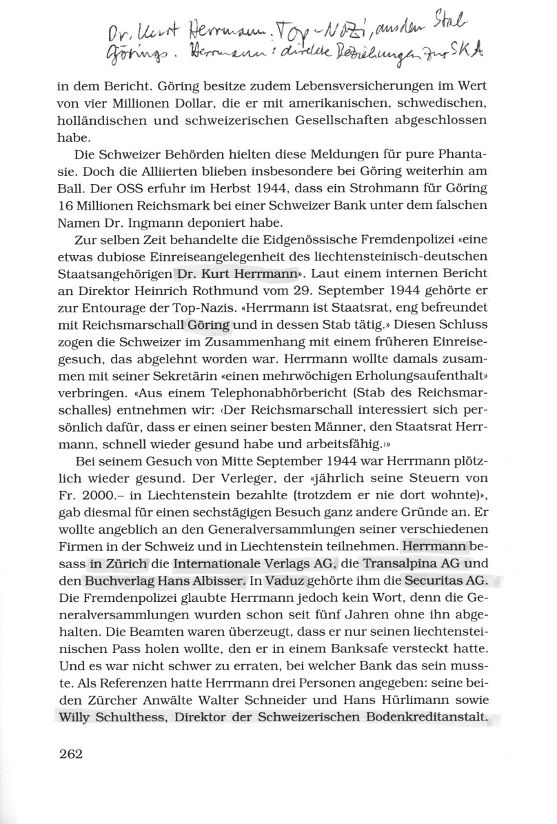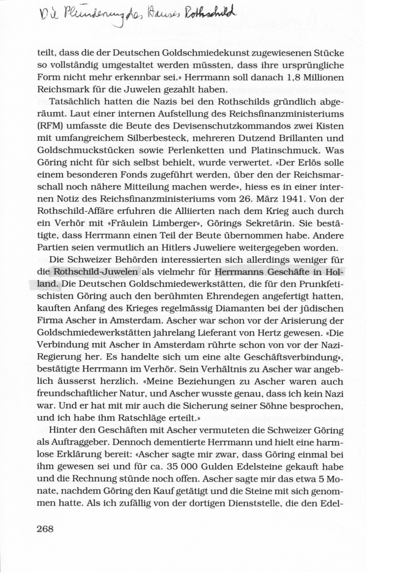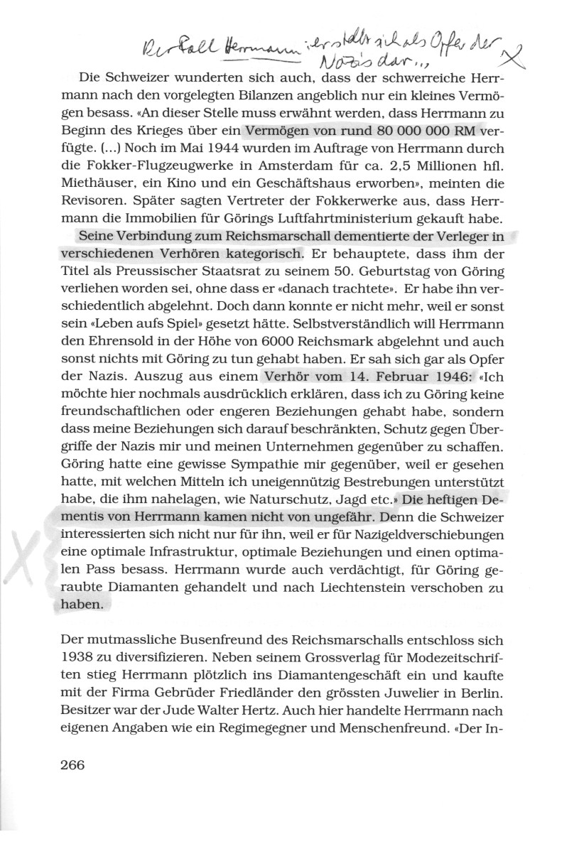 Seite 274: Dokument der Schweinzerischen (Schweizerischen) Verrechnungsstelle von 1947 mit Indizien, die gegen den Deutsch-Liechtensteiner Herrmann sprechen: Trotz schwerwiegender Indizien wollte das Eidgenössische Politische Departement (Aussenministerium) von einer Weiterverfolgung der Affäre Herrmann nichts wissen.Seite 275: Göring: Prunkfetischist Hermann Göring liess seinen Ehrendegen in Herrmanns Goldschmiedewerkstätten herstellen [seine Befehle zur "Verwertung" von Raubschmuck raubten allen Juden in Deutschland jeden Schmuck, und in der Schweinz (Schweiz) profitierten davon die Schmuckhändler, die "Verwertung" hatte ihr Zentrum in in Luzern].