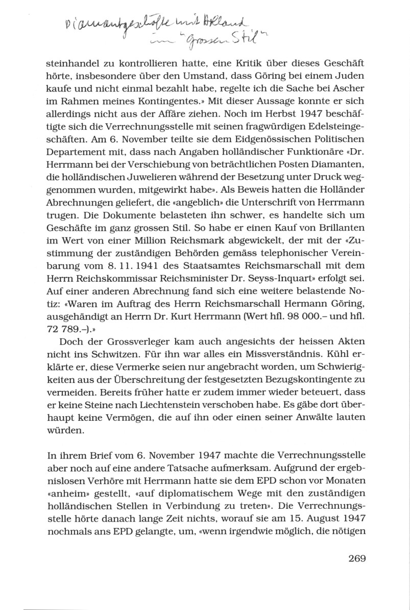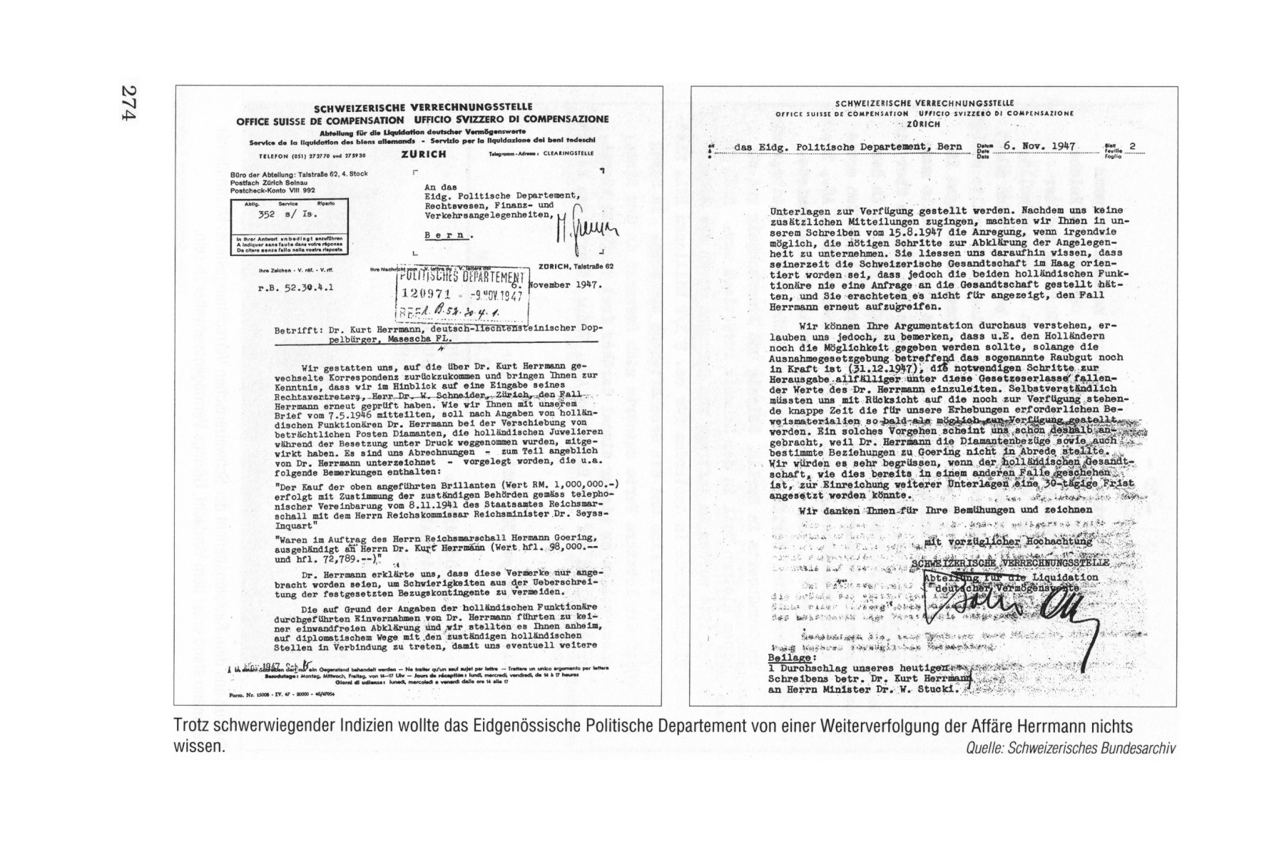 In ihrem Brief vom 6. November 1947 machte die Verrechnungsstelle aber noch auf eine andere Tatsache aufmerksam. Aufgrund der ergebnislosen Verhöre mit Herrmann hatte sie dem EPD [schweizer Aussenministerium] schon vor Monaten "anheim" gestellt, "auf diplomatischem Wege mit den zuständigen holländischen Stellen in Verbindung zu treten". Die Verrechnungsstelle hörte danach lange Zeit nichts, worauf sie am 15. August 1947 nochmals ans EPD gelangte, um, "wenn irgendwie möglich, die nötigen (S.269)