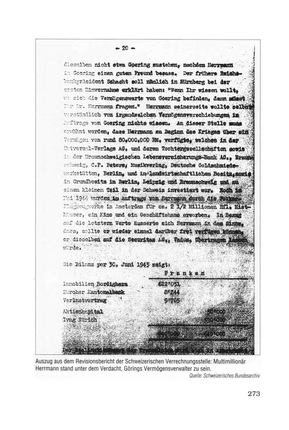 Seite 273: Dokument der Verrechnungsstelle über den Deutsch-Liechtensteiner Herrmann: Auszug aus dem Revisionsbericht der Schweinzerischen (Schweizerischen) Verrechnungsstelle: Multimillionär Herrmann stand unter dem Verdacht, Görings Vermögensverwalter zu sein [die Millionen gehören der deutschen Bevölkerung]
