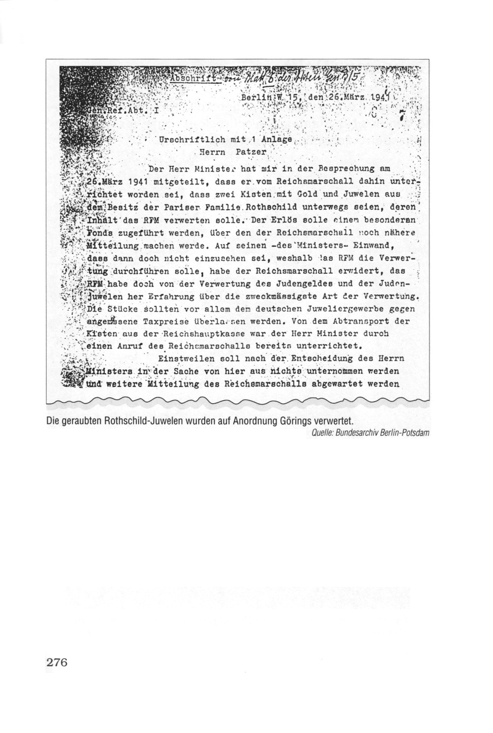 Seite 276: Dokument über die "Verwertung" von Rothschild-Juwelen: Die geraubten Rothschild-Juwelen wurden auf Anordnung Görings verwertet. [Der Standort für die "Verwertung" von Raubkunst und Raubschmuck war Luzern].