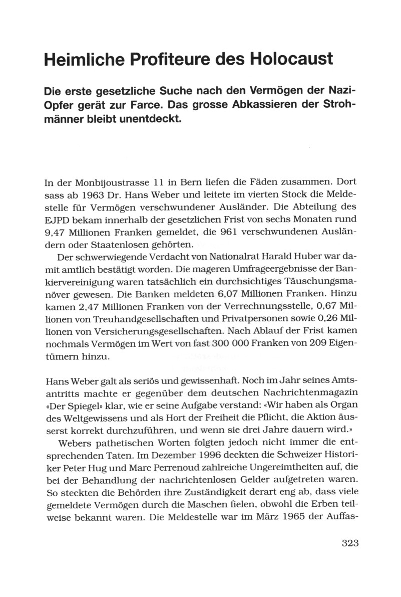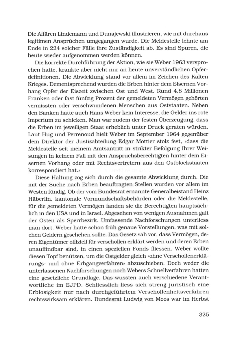 Webers pathetischen Worten folgten jedoch nicht immer die entsprechenden Taten. Im Dezember 1996 deckten die schweizer Historiker Peter Hug und Marc Perrenoud zahlreiche Ungereimtheiten auf, die bei der Behandlung der nachrichtenlosen Gelder aufgetreten waren. So steckten die Behörden ihre Zuständigkeit derart eng ab, dass viele gemeldete Vermögen durch die Maschen fielen, obwohl die Erben teilweise bekannt waren. Die Meldestelle war im März 1965 der Auffassung (S.323),