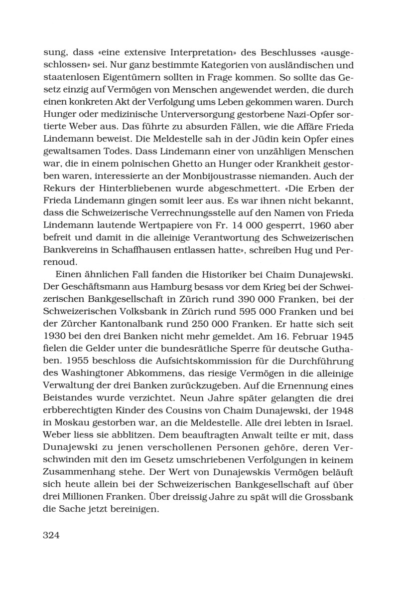 Einen ähnlichen Fall fanden die Historiker bei Chaim Dunaiewski. Der Geschäftsmann aus Hamburg besass vor dem Krieg bei der Schweizerischen Bankgesellschaft in Zürich rund 390.000 Franken, bei der Schweizerischen Volksbank in Zürich rund 595.000 Franken und bei der Zürcher Kantonalbank rund 250.000 Franken. Er hatte sich seit 1930 bei den drei Banken nicht mehr gemeldet. Am 16. Februar 1945 fielen die Gelder unter die bundesrätliche Sperre für deutsche Guthaben. 1955 beschloss die Aufsichtskommission für die Durchführung des Washingtoner Abkommens, das riesige Vermögen in die alleinige Verwaltung der drei Banken zurückzugeben. Auf die Ernennung eines Beistandes wurde verzichtet. Neun Jahre später gelangten die drei erbberechtigten Kinder des Cousins von Chaim Dunajewski, der 1948 in Moskau gestorben war, an die Meldestelle. Alle drei lebten in Israel. Weber liess sie abblitzen. Dem beauftragten Anwalt teilte er mit, dass Dunajewski zu jenen verschollenen Personen gehöre, deren Verschwinden mit den im Gesetz umschriebenen Verfolgungen in keinem Zusammenhang stehe. Der Wert von Dunajewskis Vermögen beläuft sich heute allein bei der Schweizerischen Bankgesellschaft [SBG, heute UBS AG] auf über drei Millionen Franken. Über dreissig Jahre zu spät will die Grossbank (S.324)