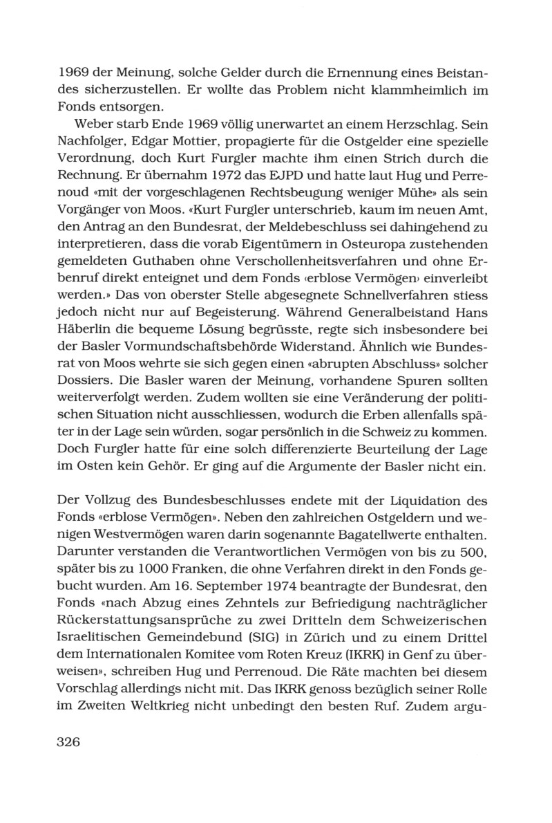"Kurt Furgler [CVP] unterschrieb, kaum im neuen Amt, den Antrag an den Bundesrat, der Meldebeschluss sei dahingehend zu interpretieren, dass die vorab Eigentümern in Osteuropa zustehenden, gemeldeten Guthaben ohne Verschollenheitsverfahren und ohne Erbenruf direkt enteignet und dem Fond 'erblose Vermögen' einverleibt werden."