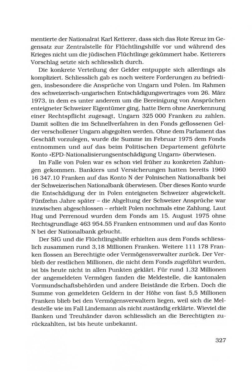 Im Falle von Polen war es schon viel früher zu konkreten Zahlungen gekommen. Bankiers und Versicherungen hatten bereits 1960 16.347,10 Franken auf das Konto N der Polnischen Nationalbank bei der Schweizerischen Nationalbank überwiesen. Über dieses Konto wurde die Entschädigung der in Polen enteigneten Schweizer abgewickelt. Fünfzehn Jahre später - die Abgeltung der schweizer Ansprüche war inzwischen abgeschlossen - erhielt Polen nochmals eine Zahlung. Laut Hug und Perrenoud wurden dem Fond am 15. August 1975 ohne Rechtsgrundlage 463.954,55 Franken entnommen und auf das Konto N bei der Nationalbank gebucht.