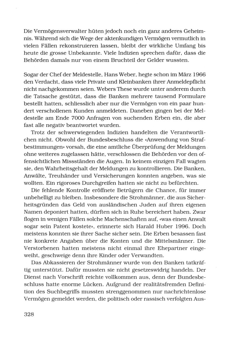 Das Abkassieren der Strohmänner wurde von den Banken tatkräftig unterstützt. Dafür mussten sie nicht gesetzeswidrig handeln. Der Dienst nach Vorschrift reichte vollkommen aus, denn der Bundesbeschluss hatte enorme Lücken. Aufgrund der realitätsfremden Definition des Suchbegriffs mussten streng genommen nur nachrichtenlose Vermögen gemeldet werden, die politisch oder rassisch verfolgten Ausländern (S.328)