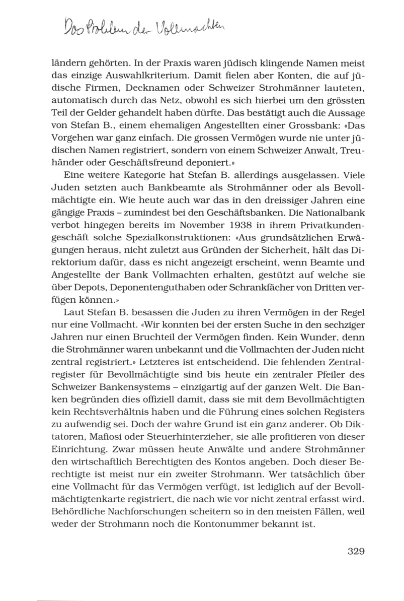 Laut Stefan B. besassen die Juden zu ihren Vermögen in der Regel nur eine Vollmacht. "Wir konnten bei der ersten Suche in den sechziger Jahren nur einen Bruchteil der Vermögen finden. Kein Wunder, denn die Strohmänner waren unbekannt und die Vollmachten der Juden nicht zentral registriert." Letzteres ist entscheidend. Die fehlenden Zentralregister für Bevollmächtigte sind bis heute ein zentraler Pfeiler des schweizer Bankensystems - einzigartig auf der ganzen Welt. Die Banken begründen dies offiziell damit, dass sie mit dem Bevollmächtigten kein Rechtsverhältnis haben und die Führung eines solchen Registers zu aufwändig sei. Doch der wahre Grund ist ein ganz anderer. Ob Diktatoren, Mafiosi oder Steuerhinterzieher, sie alle profitieren von dieser Einrichtung. Zwar müssen heute Anwälte und andere Strohmänner den wirtschaftlich Berechtigen des Kontos angeben. Doch dieser Berechtigte ist meist nur ein zweiter Strohmann. Wer tatsächlich über eine Vollmacht für das Vermögen verfügt, ist lediglich auf der Bevollmächtigtenkarte registriert, die nach wie vor nicht zentral erfasst wird. Behördliche Nachforschungen scheitern so in den meisten Fällen, weil weder der Strohmann noch die Kontonummer bekannt ist (S.329).