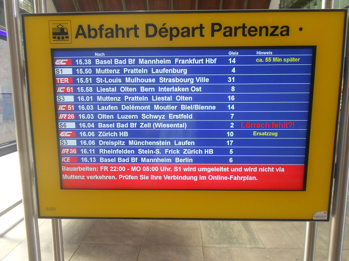 Die Fahrtenanzeige der S6 am Bahnhof SBB: Lörrach fehlt, WIESO?