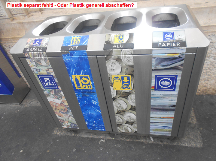 7) Müllsortierung: Plastik fehlt: Bei der Müllsortierung z.B. im Bahnhof SBB fehlt jeweils Plastik extra (man könnte auch das Plastik durch Hanf ersetzen oder so? Die Bevölkerung wartet drauf!). –