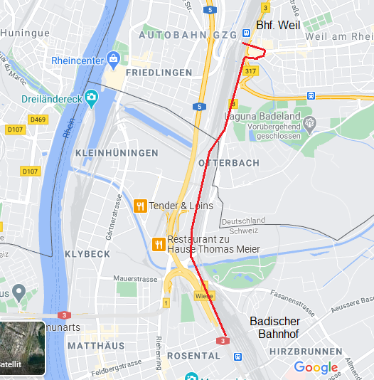 Die Idee eines direkten Trams vom Badischen Bahnhof nach Weil entlang der Eisenbahn (Karte von google maps)
