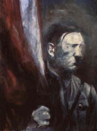An early picture of his was a portrait of Adolph Hitler painted with his own blood from self-inflicted razor cuts to the palms of his hands. Having painted Hitler portraits throughout the 1970's he began to attract attentions. Ironically some of it came from Neo-Nazis knocking on his door to see the freshly painted portraits of the "Fuhrer". Another irony is the fact that Helnwein studied at the Academy of Fine Arts in Vienna - as indeed did Hitler [WRONG: Hitler was never accepted as a paintor in Vienna but had to starve in the men's hostel where he read "national literature" and "Germanic literature"].Power is given to Helnwein's confrontations on canvas by virtue of him being an extremely skilled painter. His photo realism is immaculate and highly effective. Even under close scrutiny, the subtle shades and invisible brushwork makes it hard to distinguish the painting from a photograph. This hyper-realism is impressive not because "it looks like a photograph" for that would cancel out the purpose of painting. It is impressive because this controlled application of paint is cool enough to create an air of photo documentation without being sterile. Helnwein creates a "photo-montage" in paint, blending his own images with genuine W.W. II photographs. The result is subtly disturbing. The atmosphere in all the paintings is slightly dreamlike and the characters appear in these dramas like spectres. "Epiphany I (Adoration of the Magi)", 1996, is a dark and brooding image of five S.S. officers gathered round a modern day Aryan goddess as the Madonna who holds a naked baby "Jesus", his black hair swept across his brow in the style of Hitler. The image is huge (2 meters by 3 meters) and of a cinematic wide screen format.