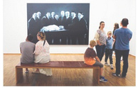 [12] Kind auf dem Tisch und 9 Männer mit meist entstellten Gesichtern rundrum: Szene im Museum: