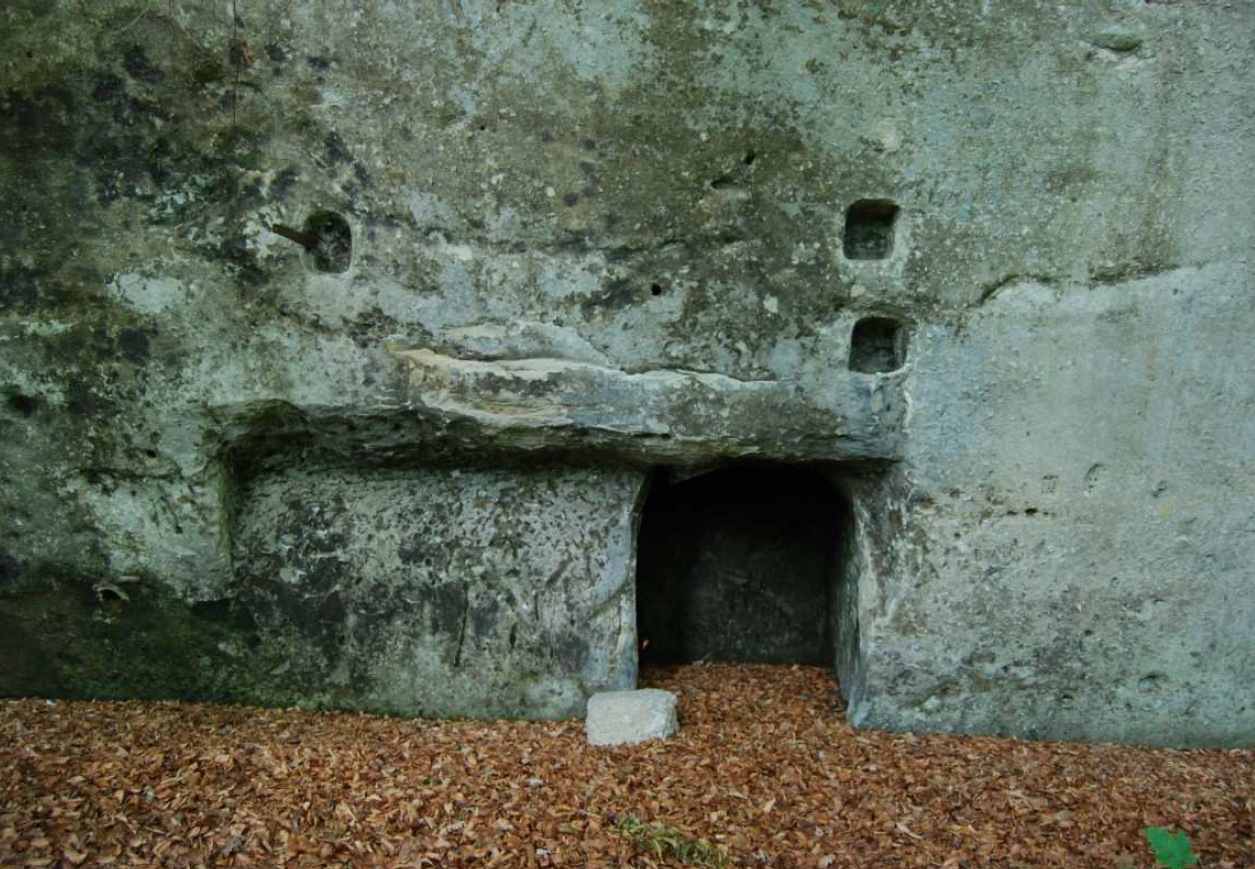 Emmental oder Entlebuch, geschnittene Felswand mit Nischen für Stützbalken etc. ohne Ortsangabe [6] - wie in Machu Picchu beim Spiegeltempel - Link