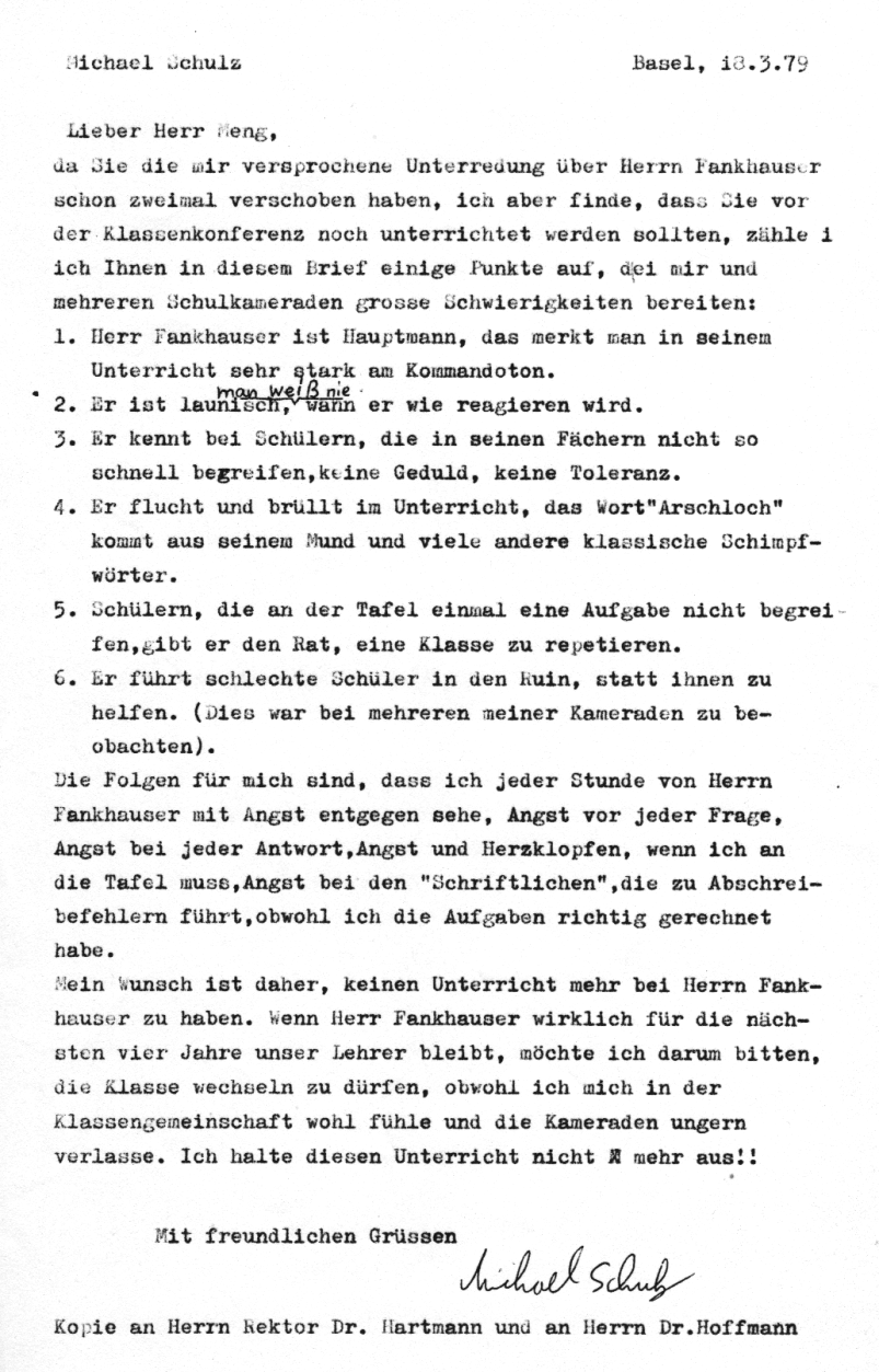 Ein eindeutiger Brief von Michael Schulz an den Klassenlehrer Meng über den kriminellen Sadisten und Militaristenlehrer Walter Fankhauser: